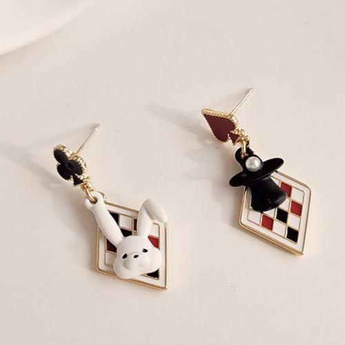 • Asymmetric Style:Designed with Intentional Asymmetry, One Earring Showcases a Charming Rabbit with a Clock, While the Other Features a Bold Red Heart and Poker Suit—creating a Playful, Eye-Catching Look.