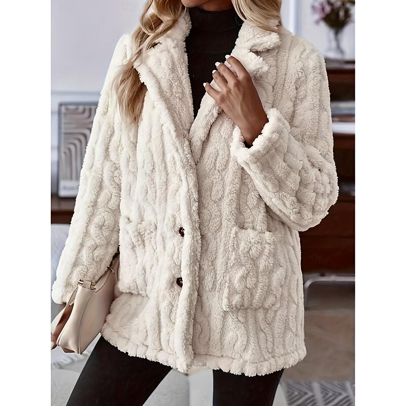 Highlights [Fabric]: Crafted from high-quality polyester, this women's jacket offers a plush and micro-elastic feel, ensuring a comfortable and warm experience throughout spring, fall, and winter. The fabric's soft cream color enhances its elegance, making it a versatile piece in any wardrobe. [Fit]: Featuring a loose, oversized fit, this jacket is designed for layering, allowing you to pair it easily with other clothing pieces for added warmth and style. The V-neck design coupled with long sleeves adds a casual yet sophisticated touch. [Design Highlights]: This jacket boasts a buttoned front and wide lapel collar, which together infuse a sense of timeless elegance. Practical side pockets offer both style and functionality, making it ideal for everyday use. [Occasions]: Perfect for daily wear, this jacket is a chic choice for a variety of settings, from casual outings to more formal occasions. Its solid color and classic design make it a reliable wardrobe staple for maintaining a warm, chic look. [Size Range]: Available in sizes S, M, L, and XL, this jacket caters to a range of body types, ensuring a suitable fit for everyone.