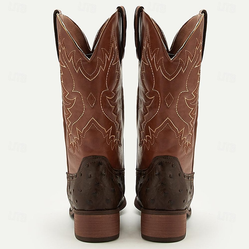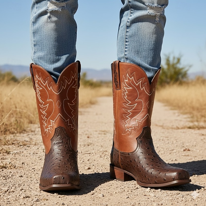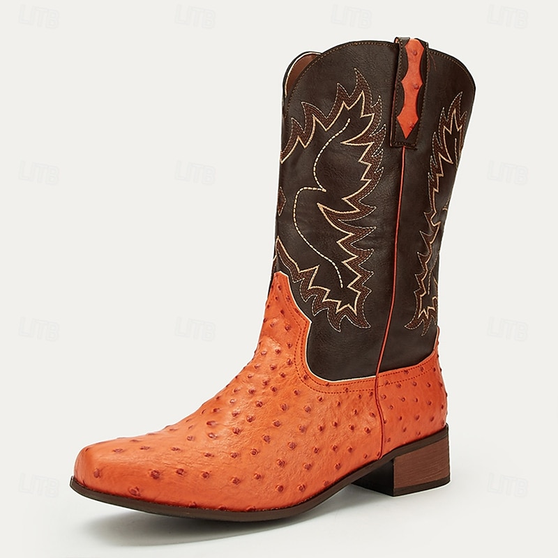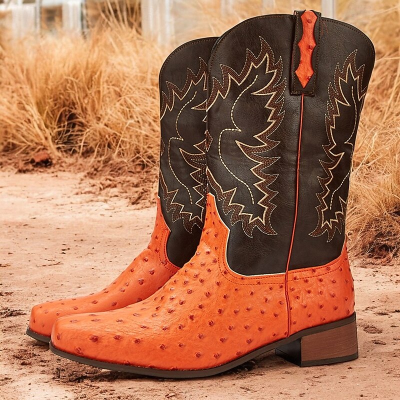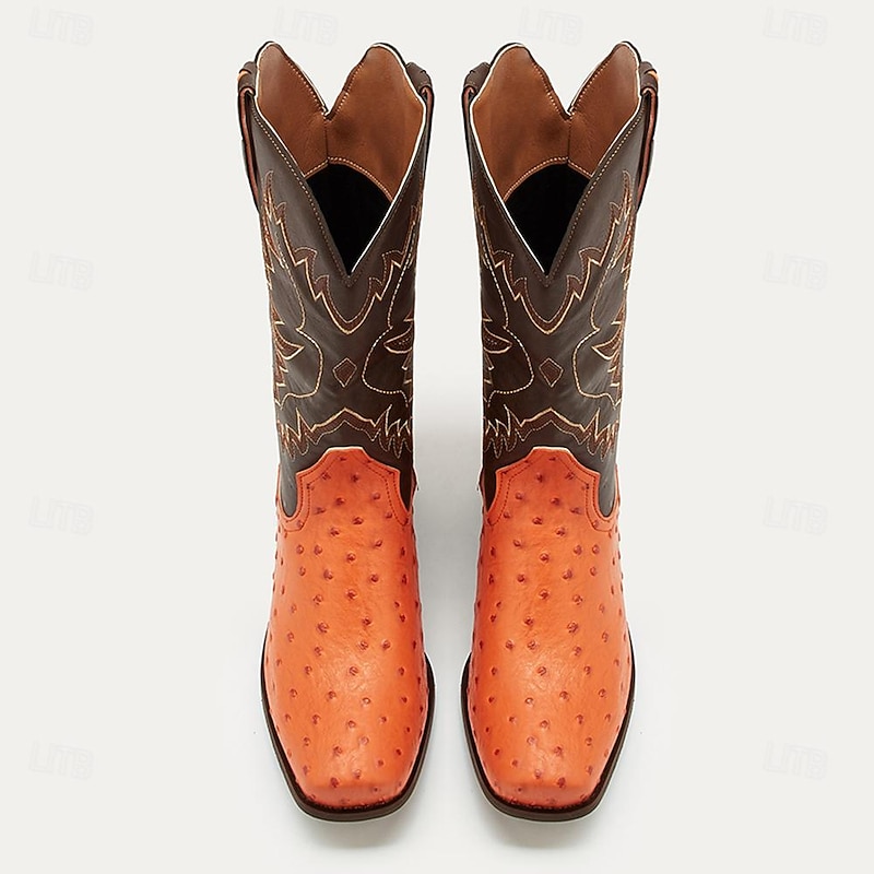 Men's Western Cowboy Boots with Orange Ostrich Leather and Dark Brown Embroidered Upper - Vintage Style for Rodeo and Casual Wear 1