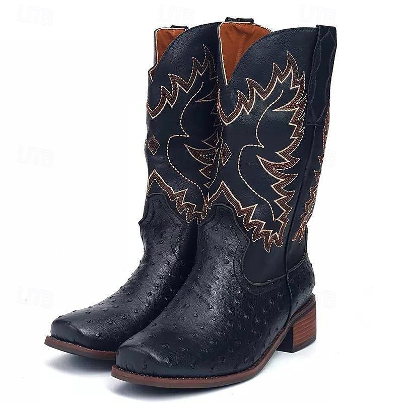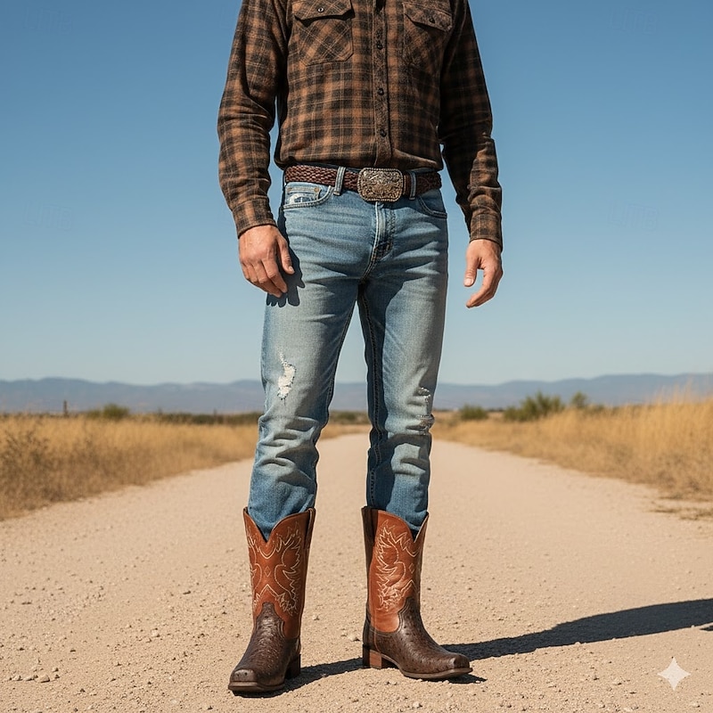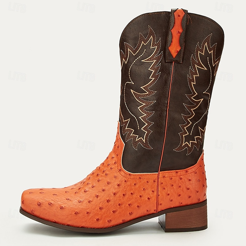 More information about Men's Western Cowboy Boots with Orange Ostrich Leather and Dark Brown Embroidered Upper - Vintage Style for Rodeo and Casual Wear