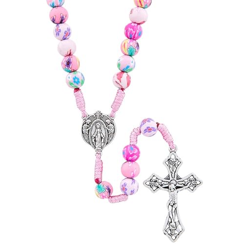 Needzo Floral Pink Cord Rosary, Colorful Prayer Bead Necklace, 16.5 Inches 5
