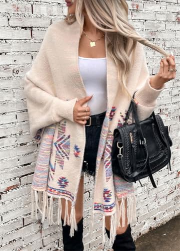 Women's Fashion Knitted Shawl Wraps Open Front Fringe Sweater Coat Ethnic Poncho Cape with Sleeves Cloak Scarf 7