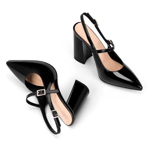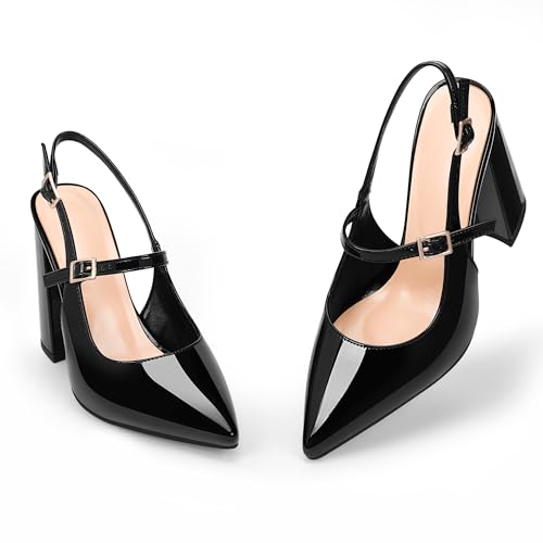 Women's Chunky High Heel Pumps Pointed Toe Slingback Buckle Strap Patent Leather Dress Shoes 6