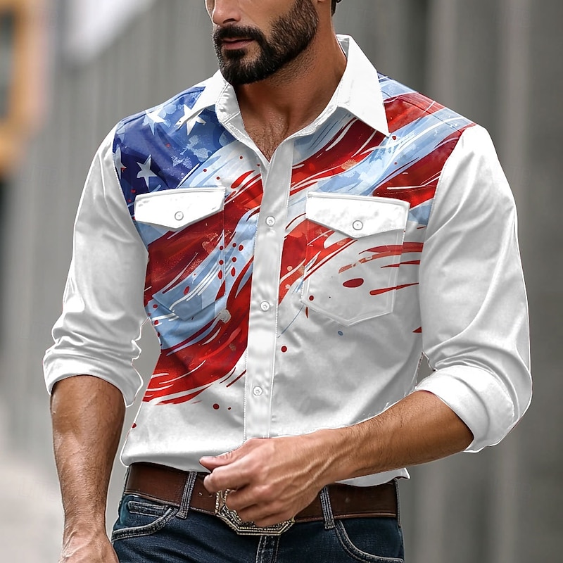 HOT ! Men's American US Flag Western Shirt Button Up Shirt Long Sleeve Western Casual Causal Casual Spring Fall Turndown Button Up 2 Pockets White 1 White White 2