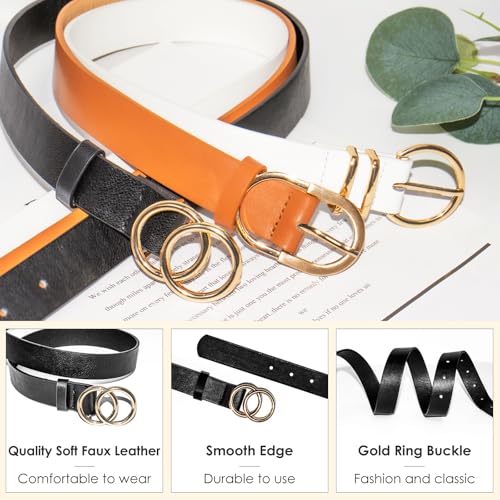 3 Pack Belts for Women, Leather Belts for Jeans Dresses Fashion Gold Buckle Ladies Belt, 3 Styles of Women's Belts (Black White Brown) 3
