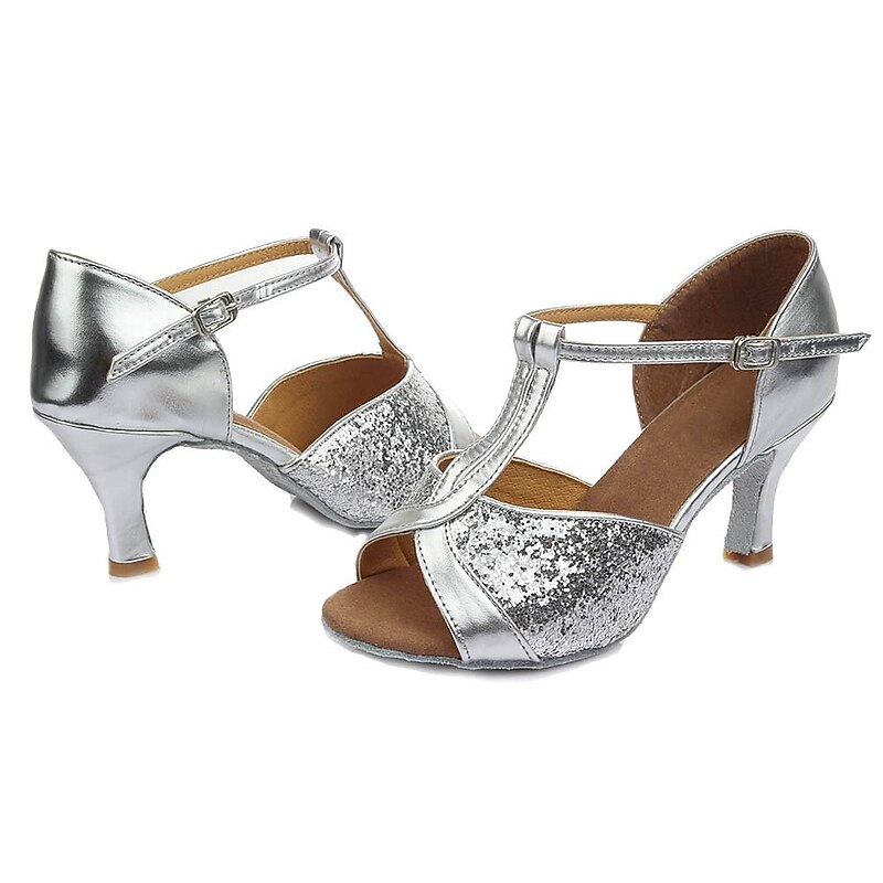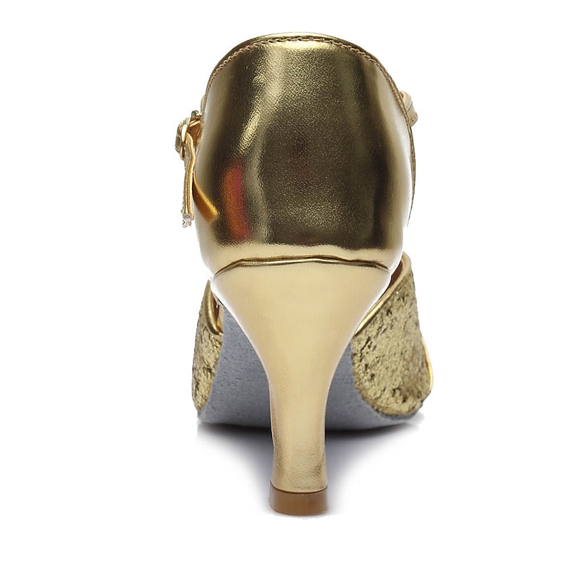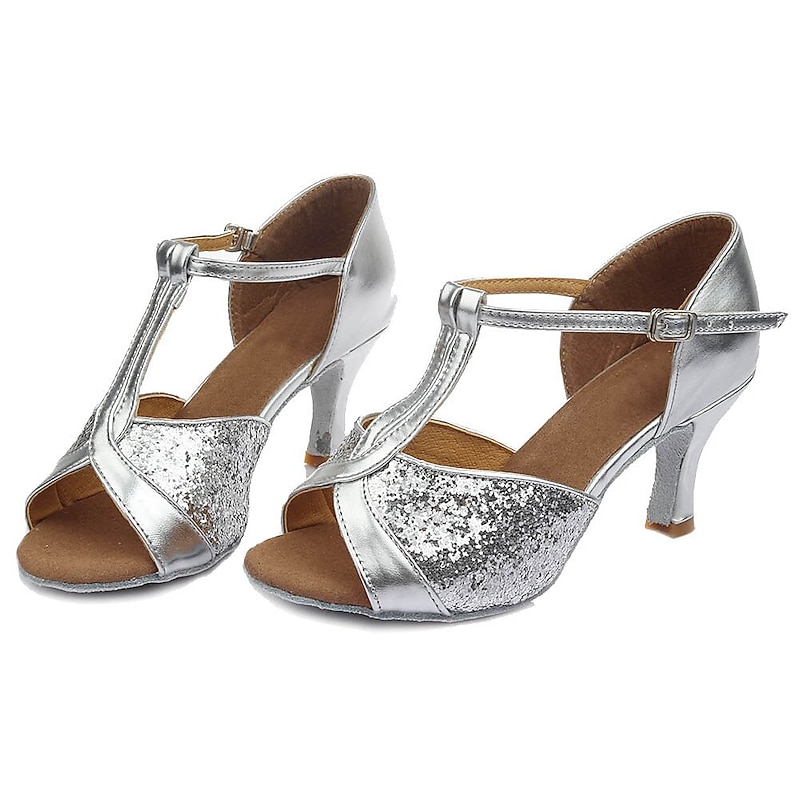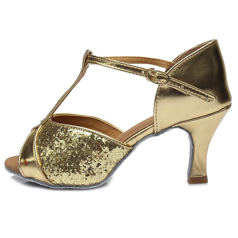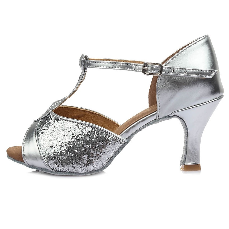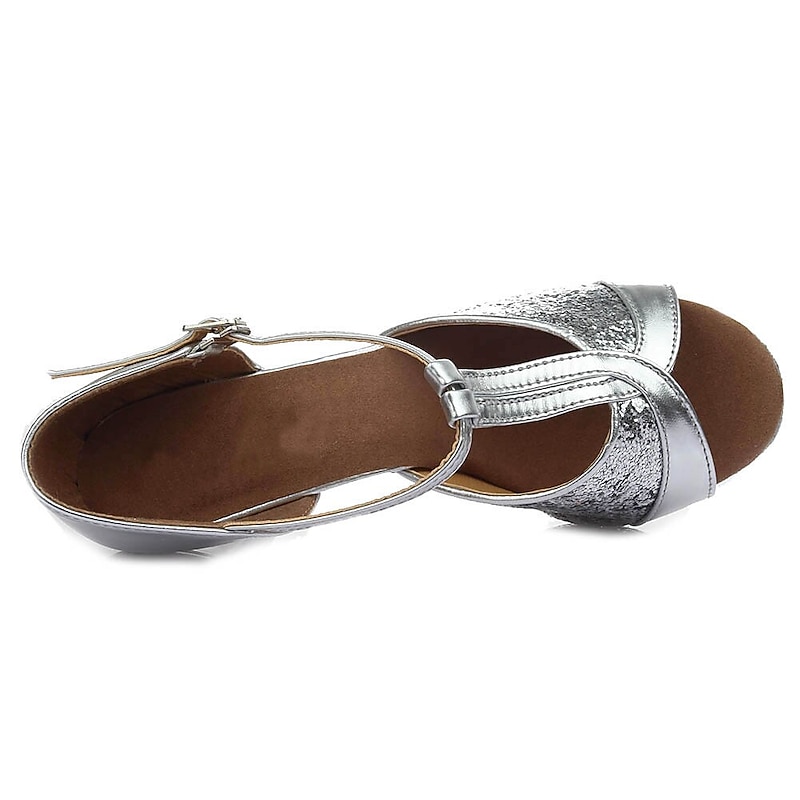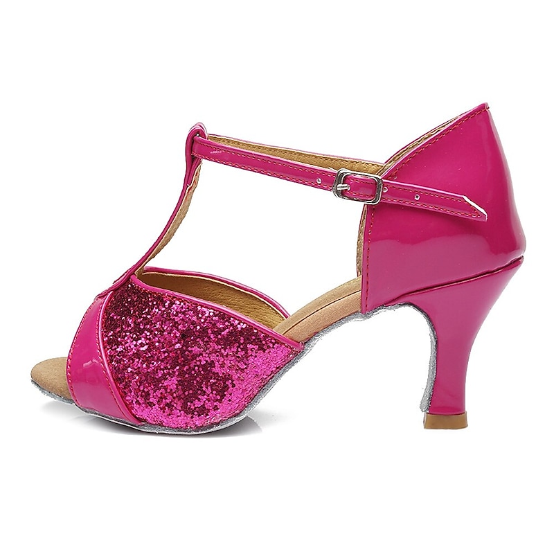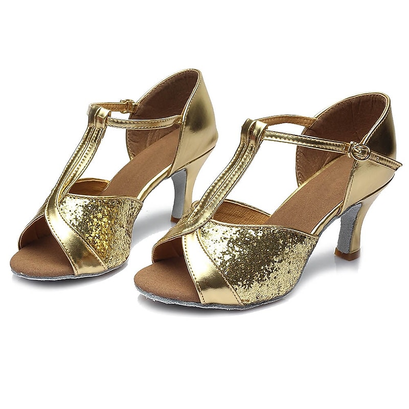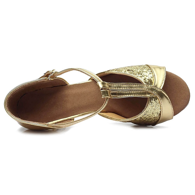 Adorned with sequins and glitter embellishments, the shoes sparkle beautifully under lights, elevating your dance attire. The buckle closure along with the T-strap style ensures a secure fit, allowing for ease of movement and slip-free dancing.