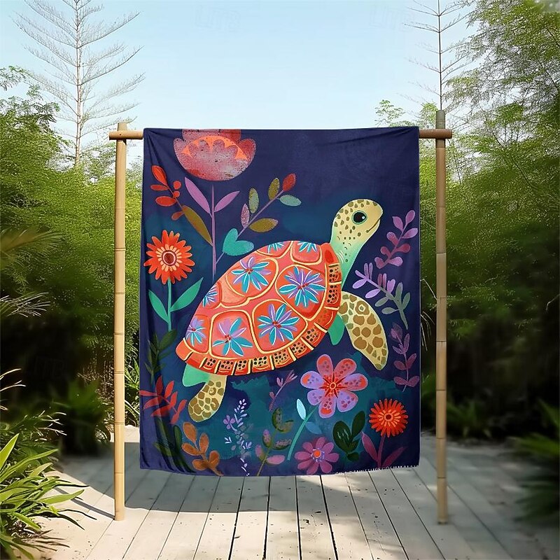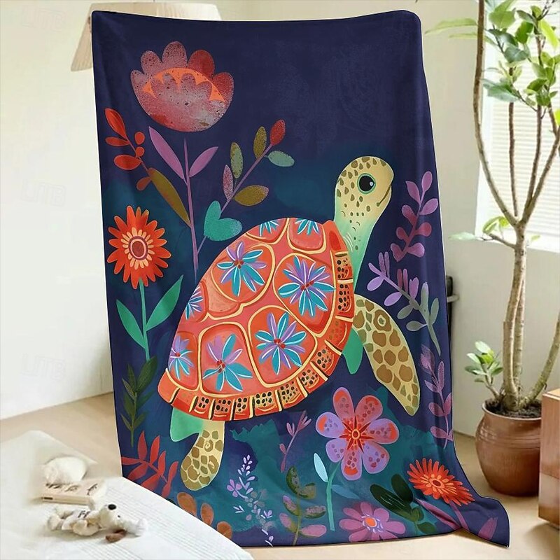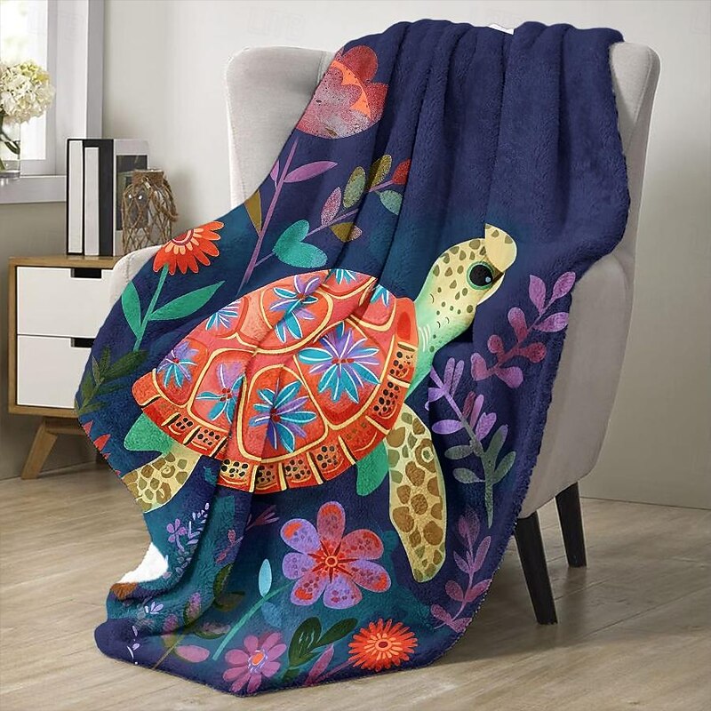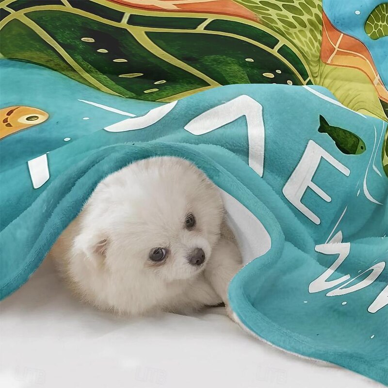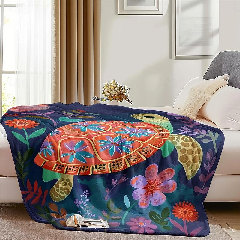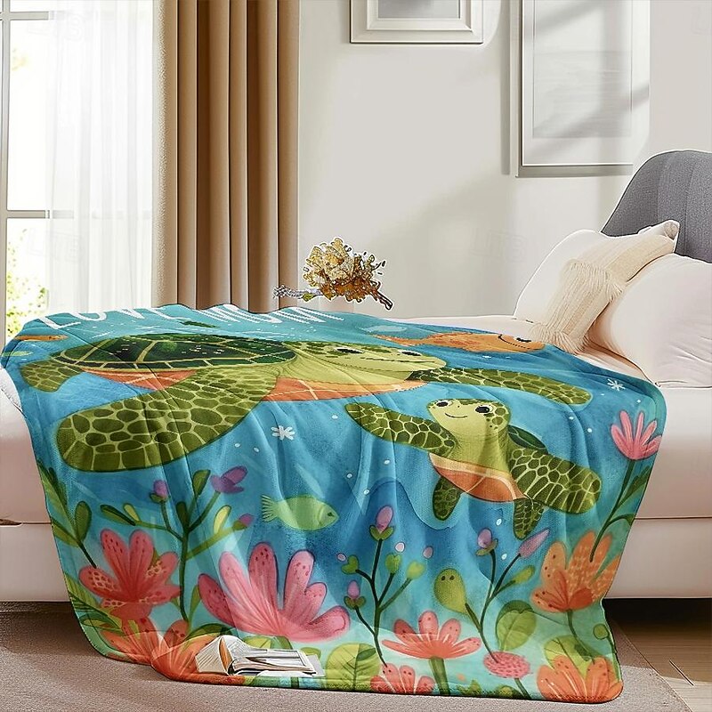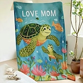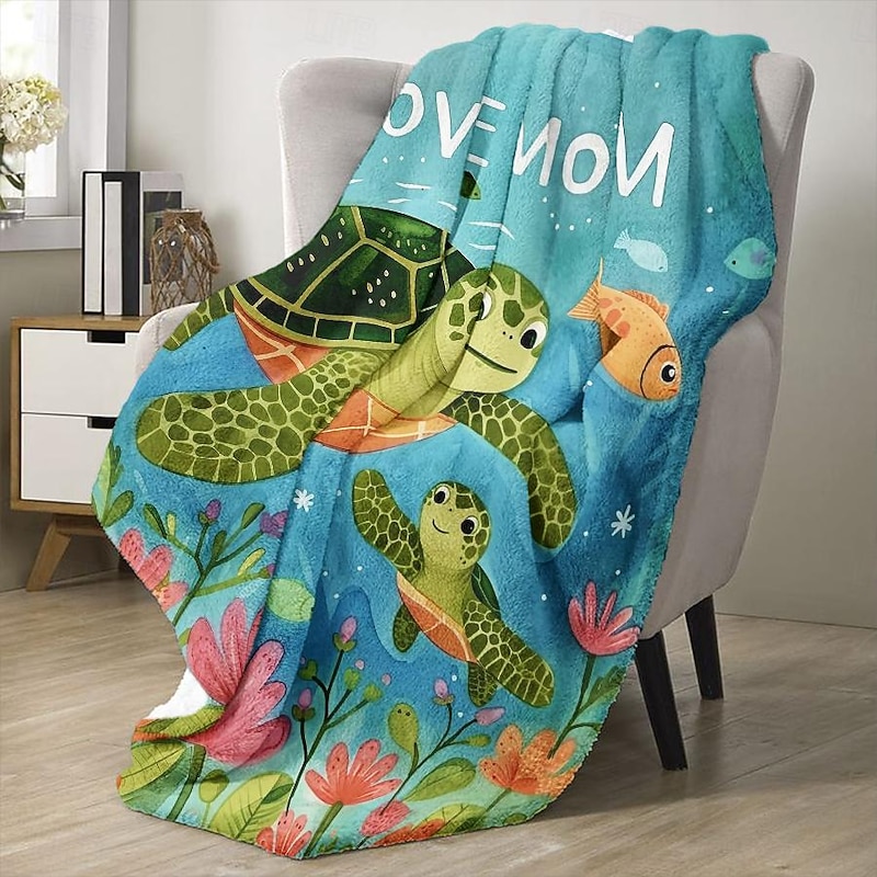 Highlights [Fabric] Crafted from luxurious flannel toison and high-quality polyester, this throw blanket offers an ultra-soft and comfy texture, ensuring warmth and relaxation through all seasons. Its thickened design provides an extra layer of coziness, ideal for snuggling on cooler evenings. [Design] The throw showcases an engaging sea turtle landscape pattern, using a vibrant 3D print technique. Featuring marine life motifs, the blanket artistically depicts sea turtles swimming alongside colorful fish amidst vivid coral and plants. The prominently displayed "LOVE MOM" text adds a heartwarming touch, making it an ideal gift or decorative piece. [Design Highlights] With its reactive print, this blanket maintains bright, cheerful colors that bring a sense of whimsy and warmth to any living space. The playful and intricate arrangement of sea life elements makes it a standout decorative throw. [Occasions] Perfect for Mother's Day, this blanket serves as a thoughtful gift, suitable for use on a couch, bed, or even as a whimsical wall tapestry. Its lightweight and durable construction make it flexible for use throughout the home, adding charm to any cozy setting. [Size] Available in three generous sizes—100x130cm (39x51in), 130x150cm (51x59in), and 150x200cm (59x79in)—this versatile blanket can cater to various needs, from providing warmth on a couch to serving as an oversized wrap.