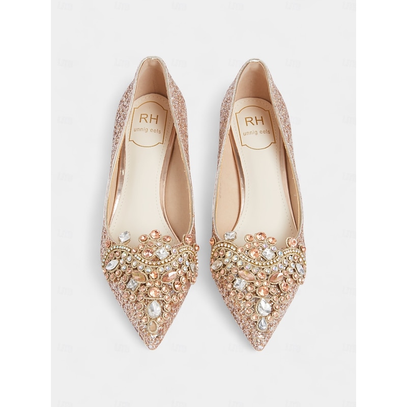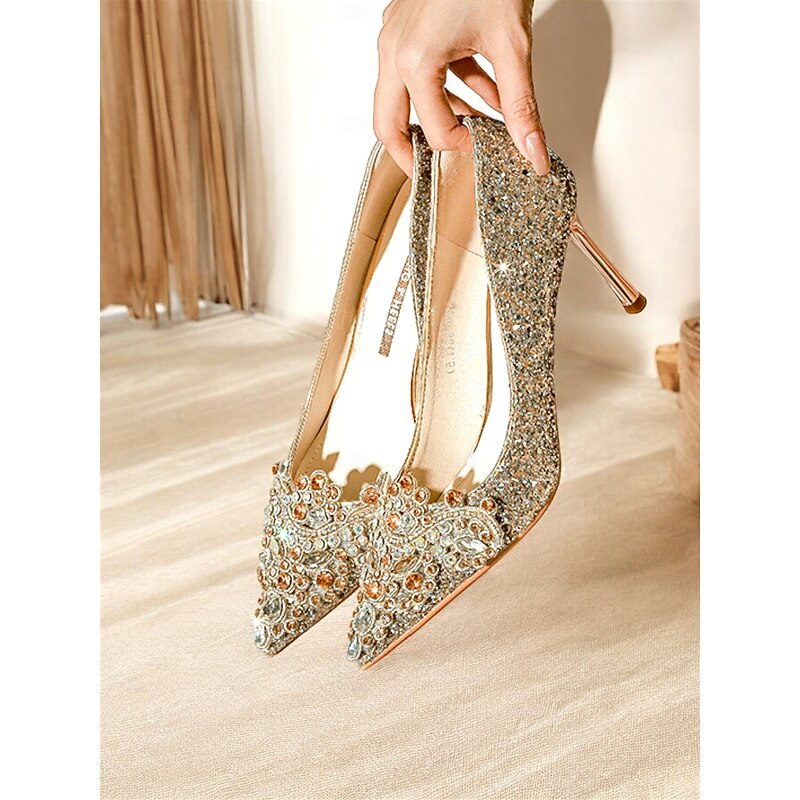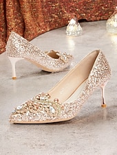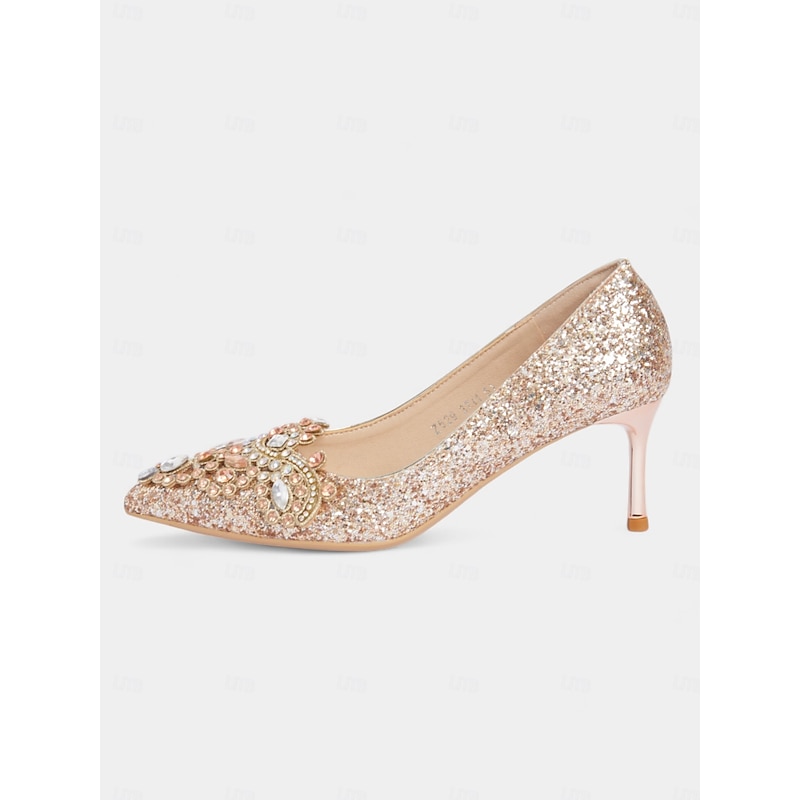 Highlights [Fabric] Crafted from sparkling glitter with a synthetic leather lining, these women’s stiletto heels are designed to shine brilliantly and offer durability. [Silhouette] Featuring a classic pointed toe design, these heels provide a graceful and feminine silhouette that is timeless and elegant. [Design Highlights] Each shoe is embellished with rhinestones and crystals on the vamps, adding an extra layer of luxury and sophistication. The slim stiletto heel enhances height while maintaining a chic style. A cushioned insole ensures comfort for prolonged wear. [Occasions] Ideal for weddings, evening parties, and other formal events, these heels add a dazzling touch to any attire, making them a standout choice for special occasions. [Size Notice] Available in standard US sizes ranging from 5.5 to 10.5, these heels are designed to fit true to size. Select your usual size for the best fit.