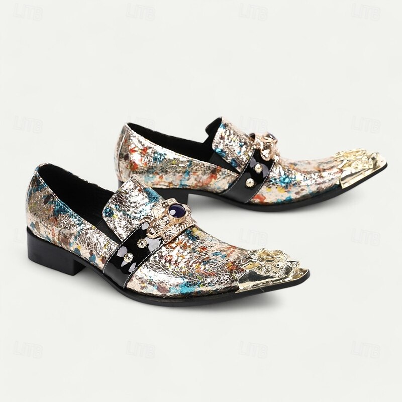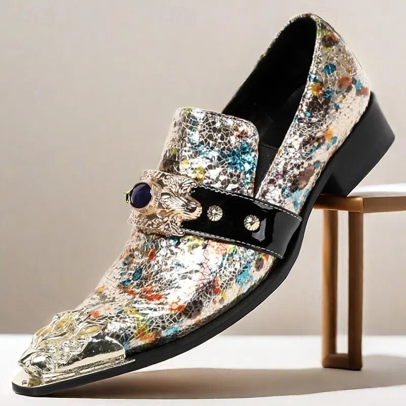 Men's Multicolor Leather Slip-On Dress Shoes with Decorative Metal Toe Cap and Jewel Accent - Premium Cowhide Formal Loafers for Parties and Weddings 1