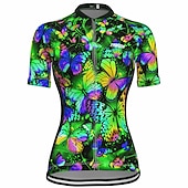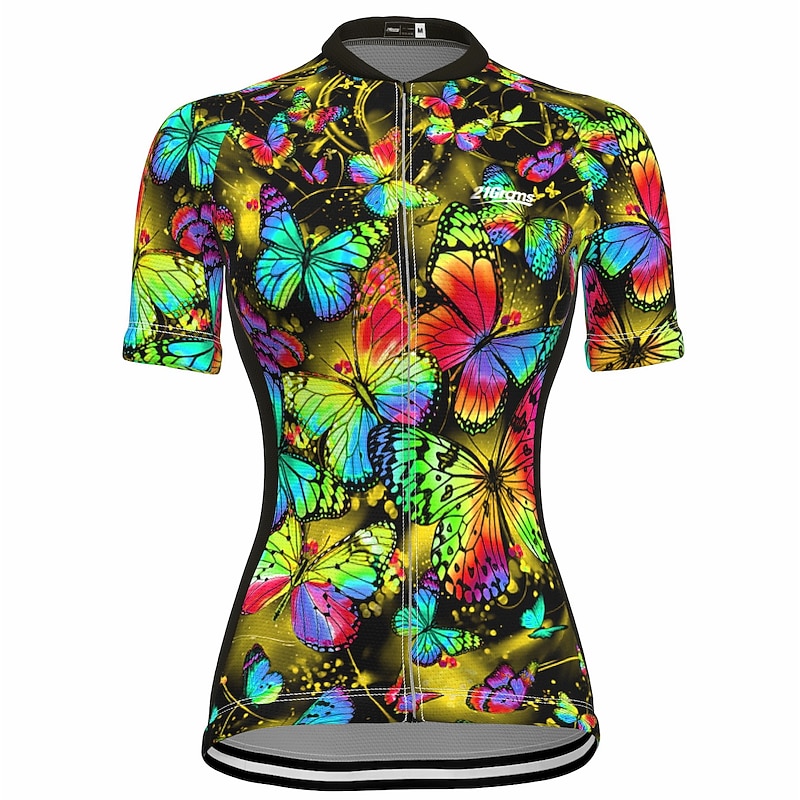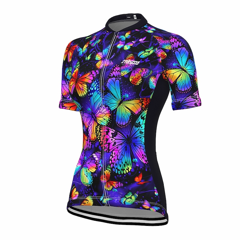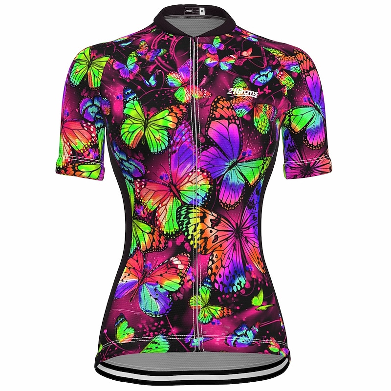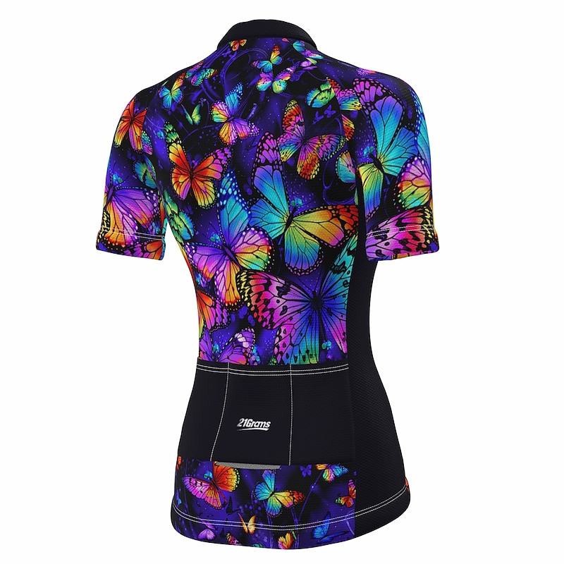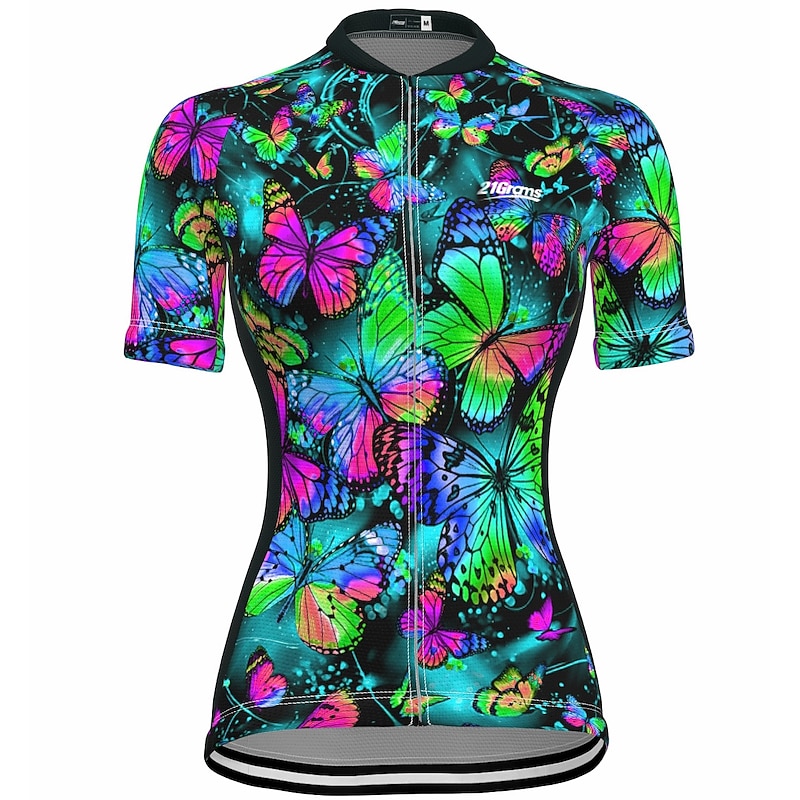 Highlights - Made of 100% polyester for a durable and lightweight cycling shirt - Provides superb wicking and breathability to keep you dry and comfortable - Features 3 pockets for storage of valuables, snacks, and other essentials - Loose fit for comfortable wear on and off the bike - Longer elastic rear hem for extra coverage - Designed with reflective elements for increased visibility in low light conditions - Bright color helps motorists see you for added safety during day and night cycling - Suitable for road bike and mountain bike use - Classic design also appropriate for leisure and urban cycling - Specifically designed for women - Stretchy fabric for added elasticity - Ideal for athleisure activities - Quick dry fabric to keep you feeling fresh - Moisture-wicking technology for sweat management - Patterned with butterfly design - Suitable for mountain bike and road bike disciplines.