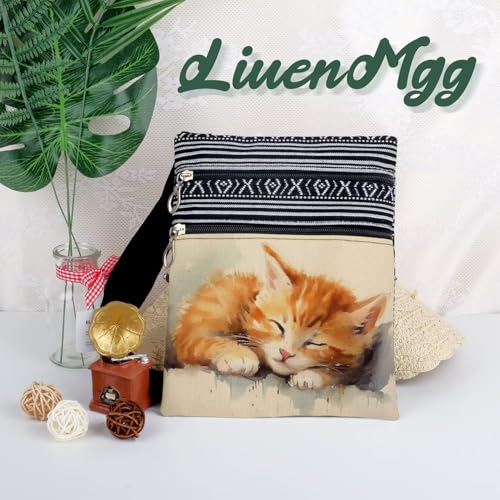 HOT ! Sleepy Kitten Messenger Bag Small Ethnic Pattern Printed Adjustable Strap Crossbody Zipper Bag Sleepy Kitten Phone Bag Wallet Cute Shoulder Handbag for Women