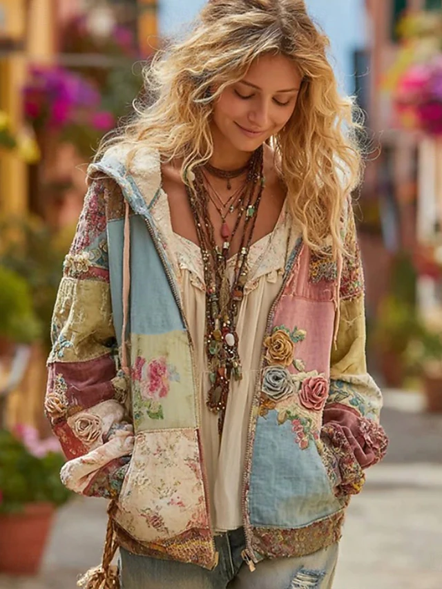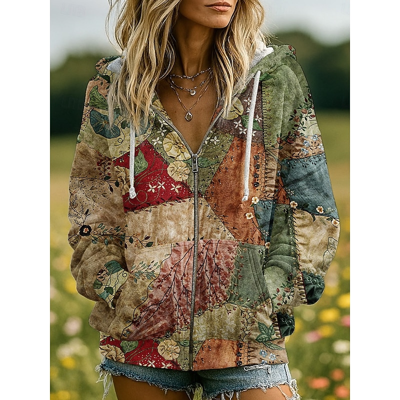 Women's 3D Print Vintage Boho Hoodie Patchwork Hoodie Sweatshirt Floral Zip Up s  Fashion Casual Long Sleeve Hooded  Street Dailywear Casual Patchwork Zipper Pocket Pink Red Blue Spring Fall 2