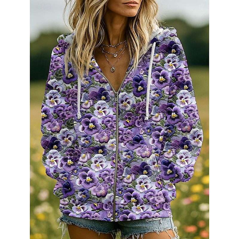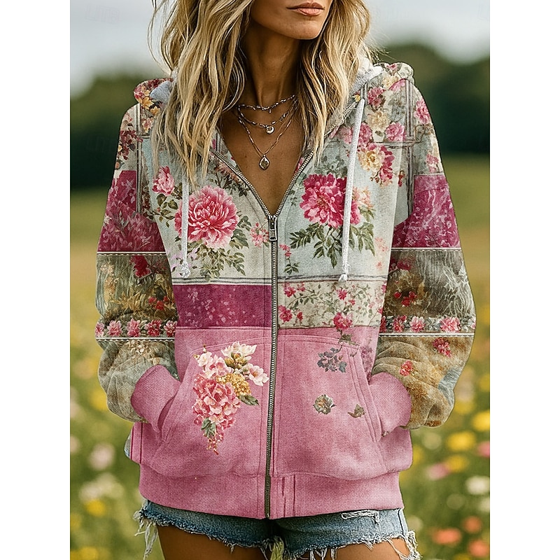 HOT ! Women's 3D Print Vintage Boho Hoodie Patchwork Hoodie Sweatshirt Floral Zip Up s Fashion Casual Long Sleeve Hooded Street Dailywear Casual Patchwork Zipper Pocket Pink Red Blue Spring Fall