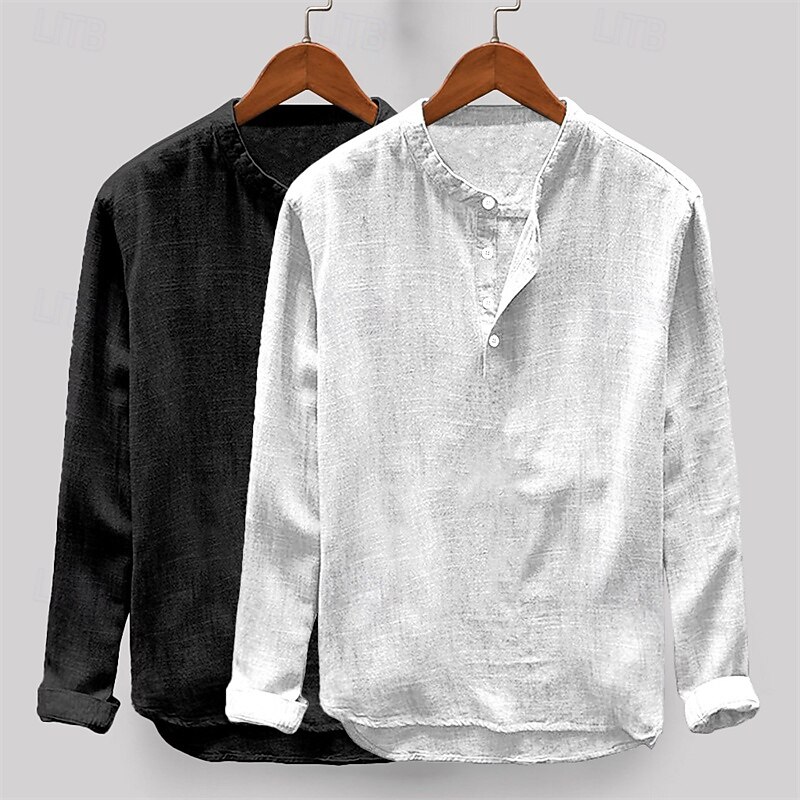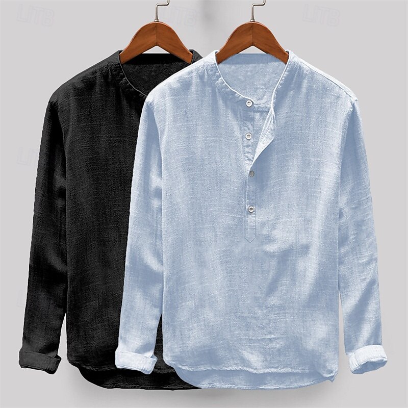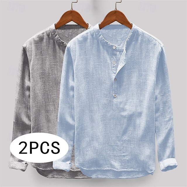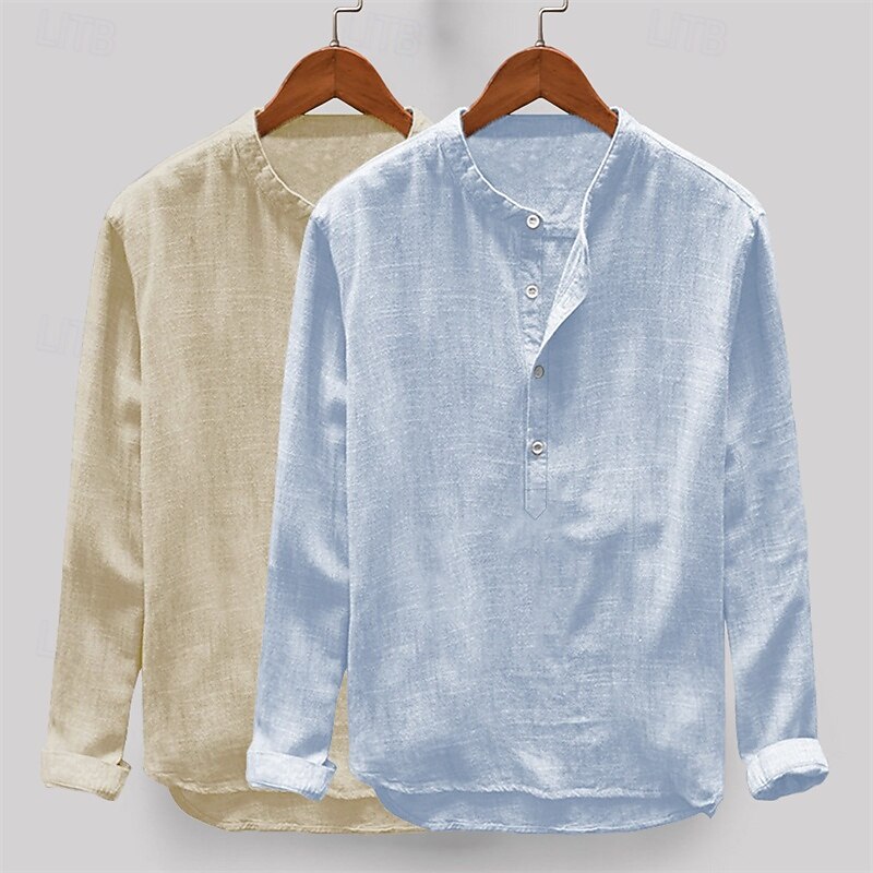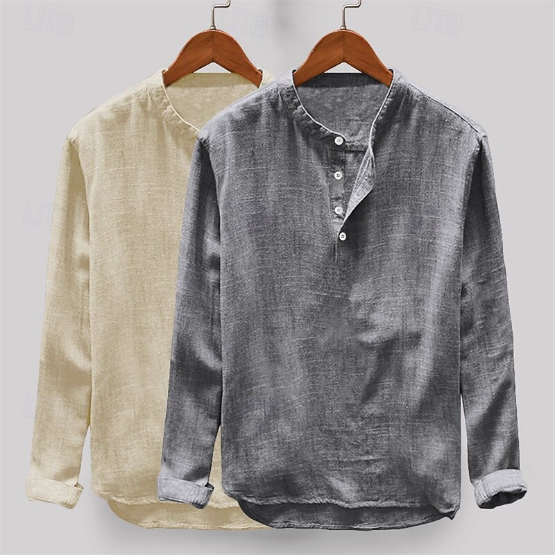 Men's Linen Shirt Band Collar Shirt Summer Shirt Beach Wear Solid Color Vacation Casual Light gray+blue Dark Gray+Light Gray Blue+Khaki Khaki+Dark Grey Long Sleeve Collar Summer Spring Clothing 14