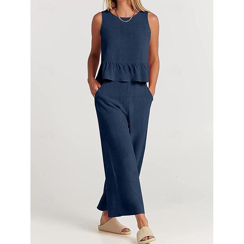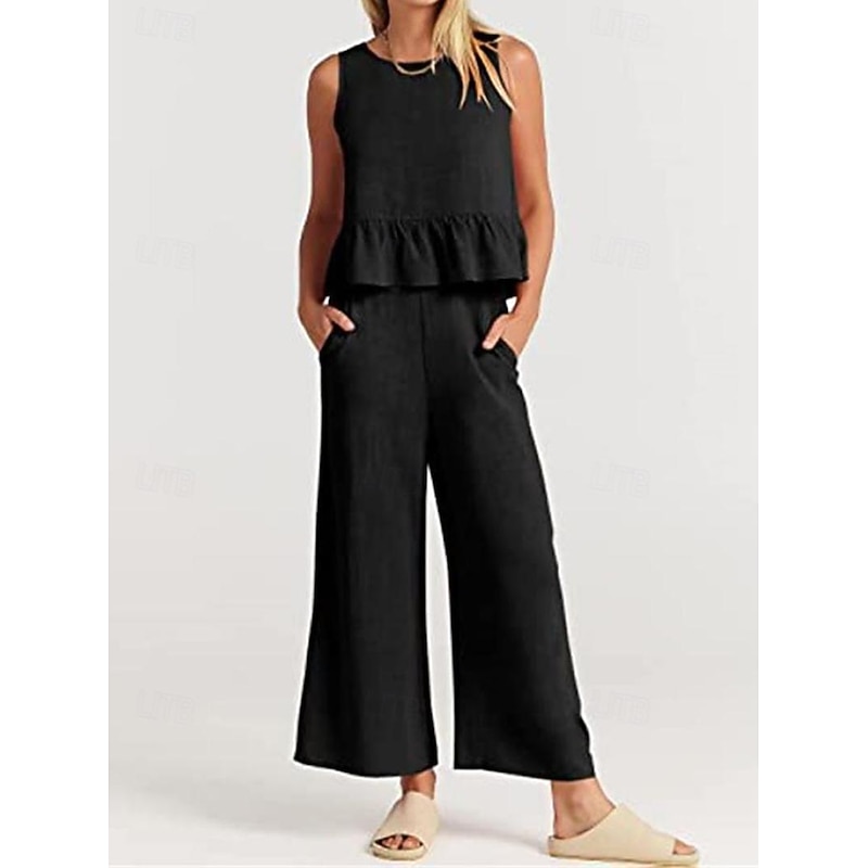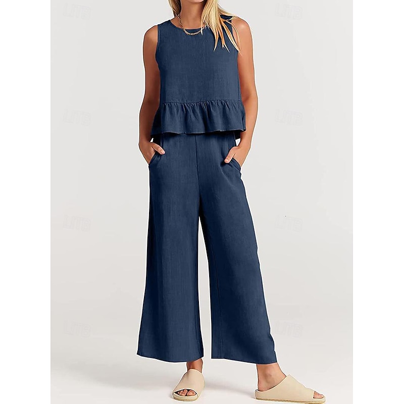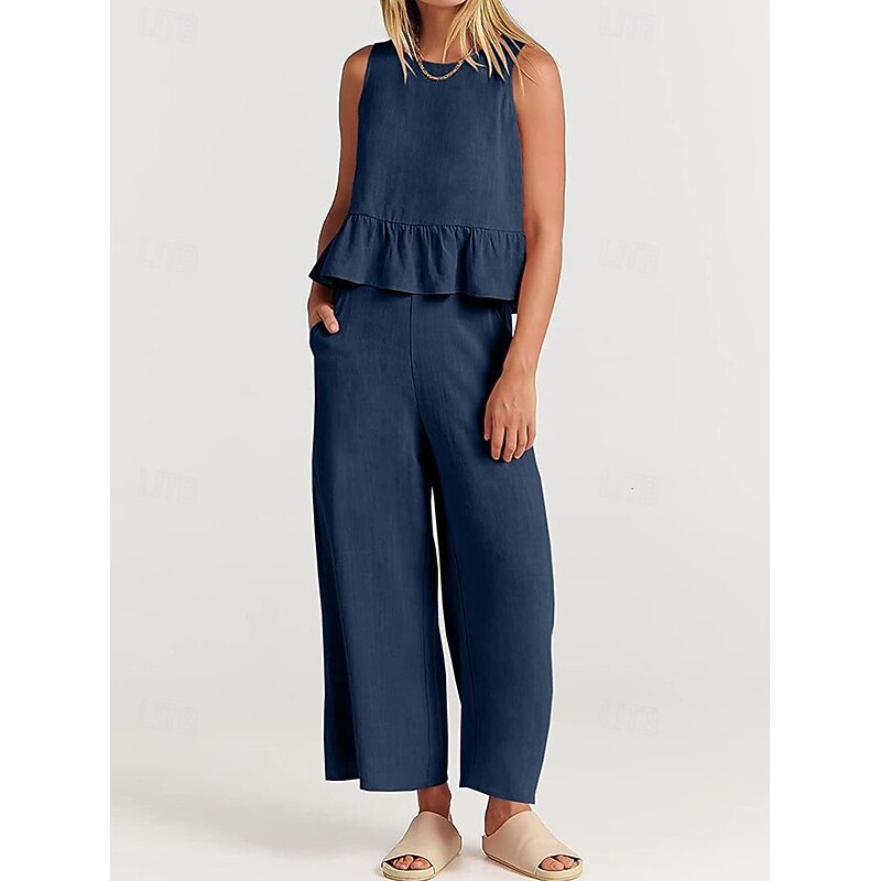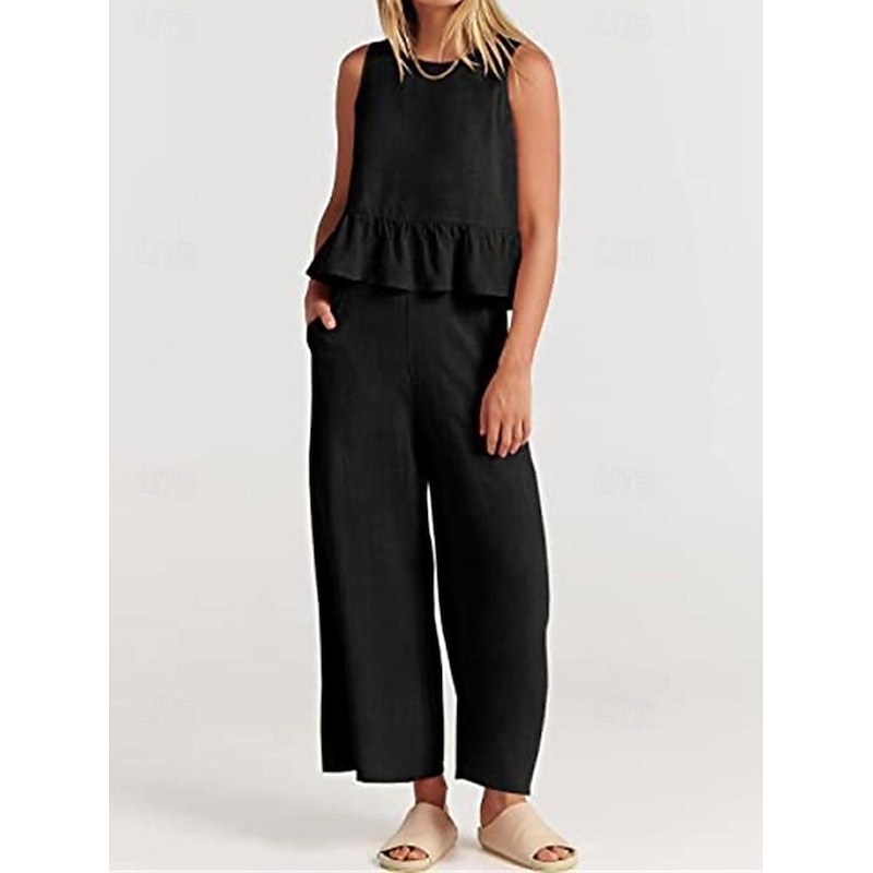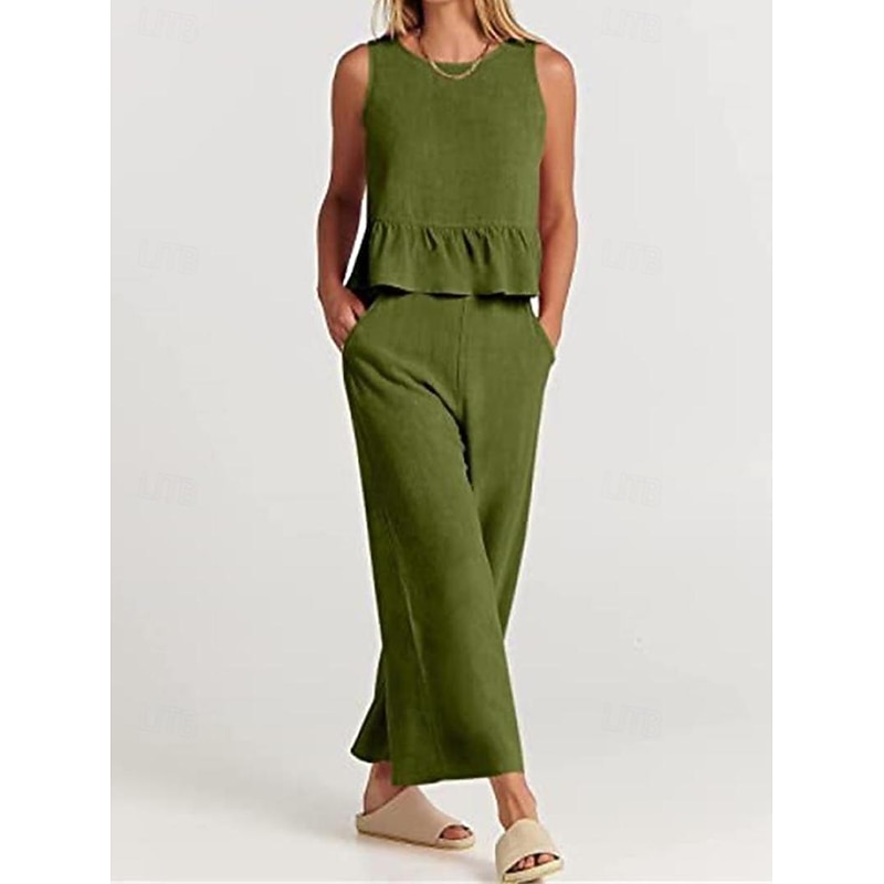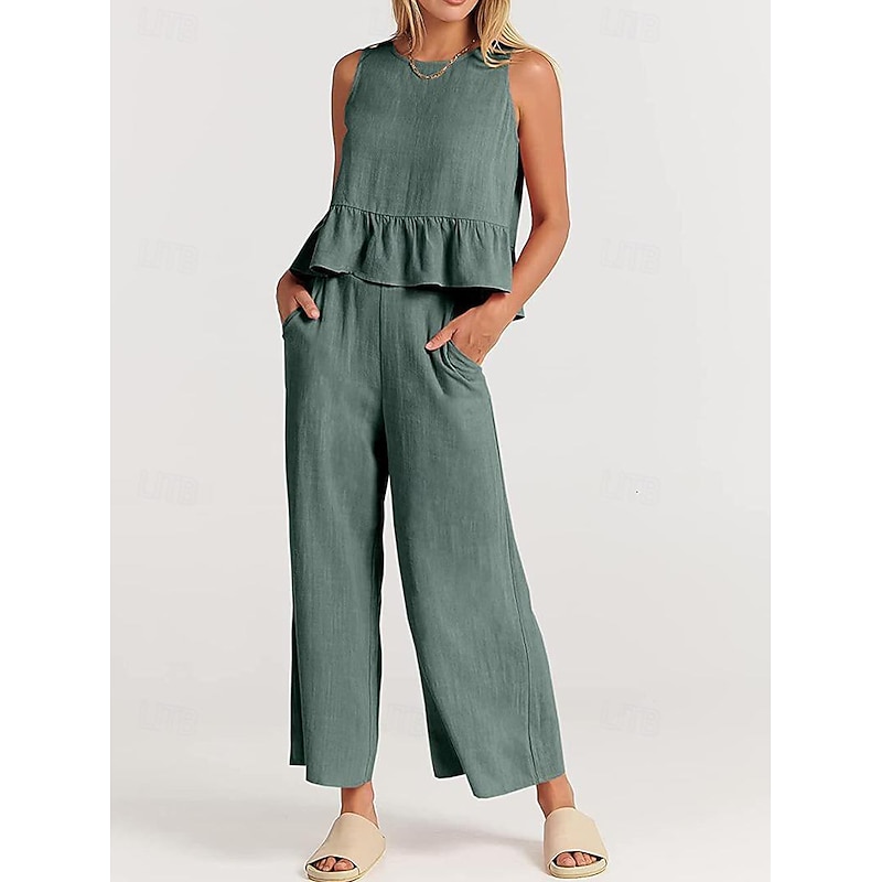 More information about Linen Set Tank Cotton Linen Shirts Set Women's Black Army Green Navy Blue Solid Color Ruffle 2 Piece Street Daily Fashion Round Neck Cotton Linen Regular Fit S