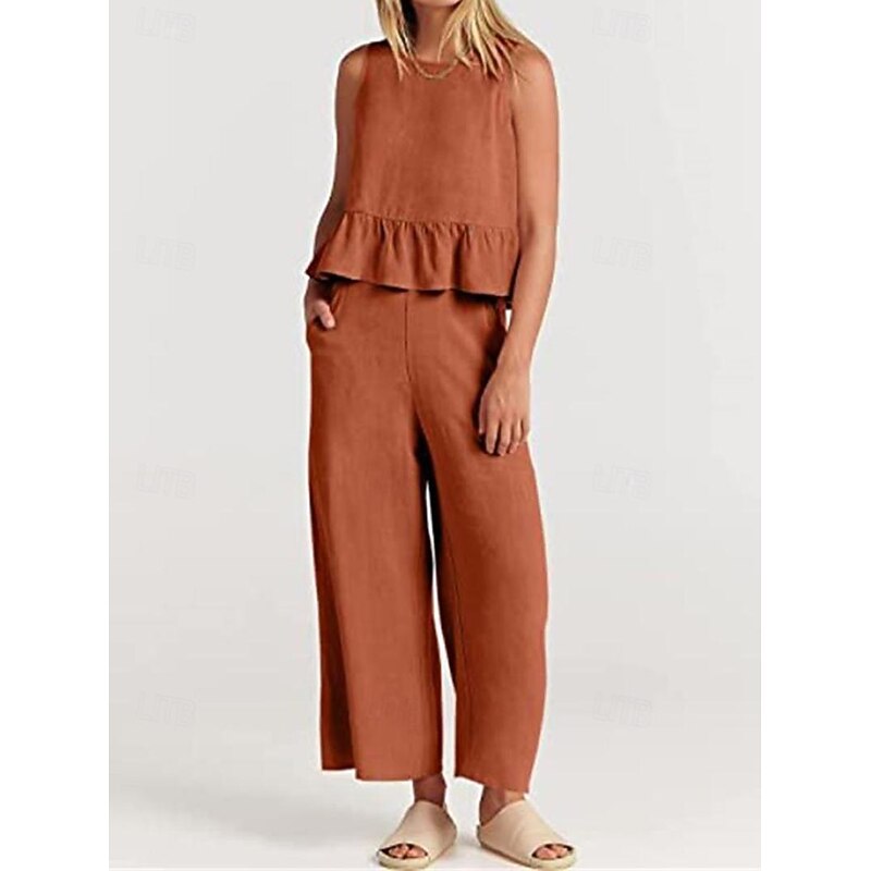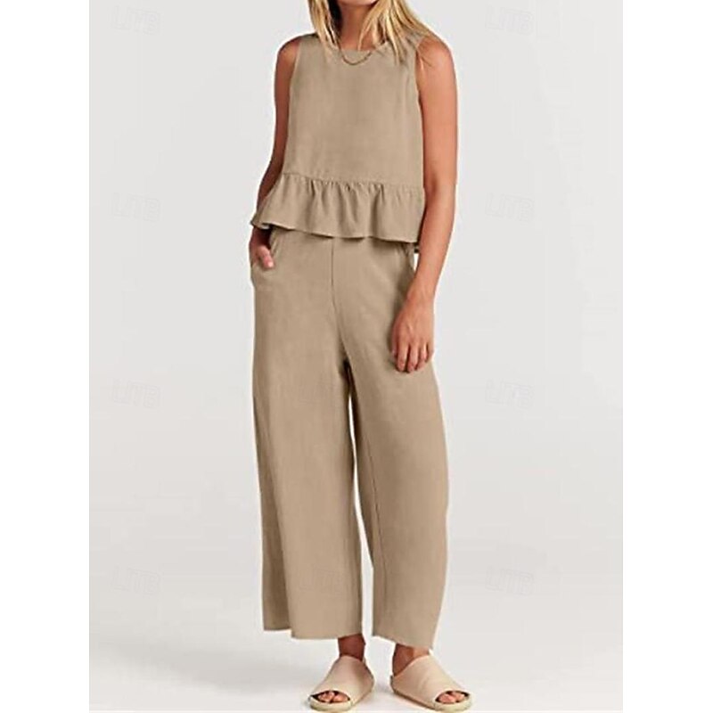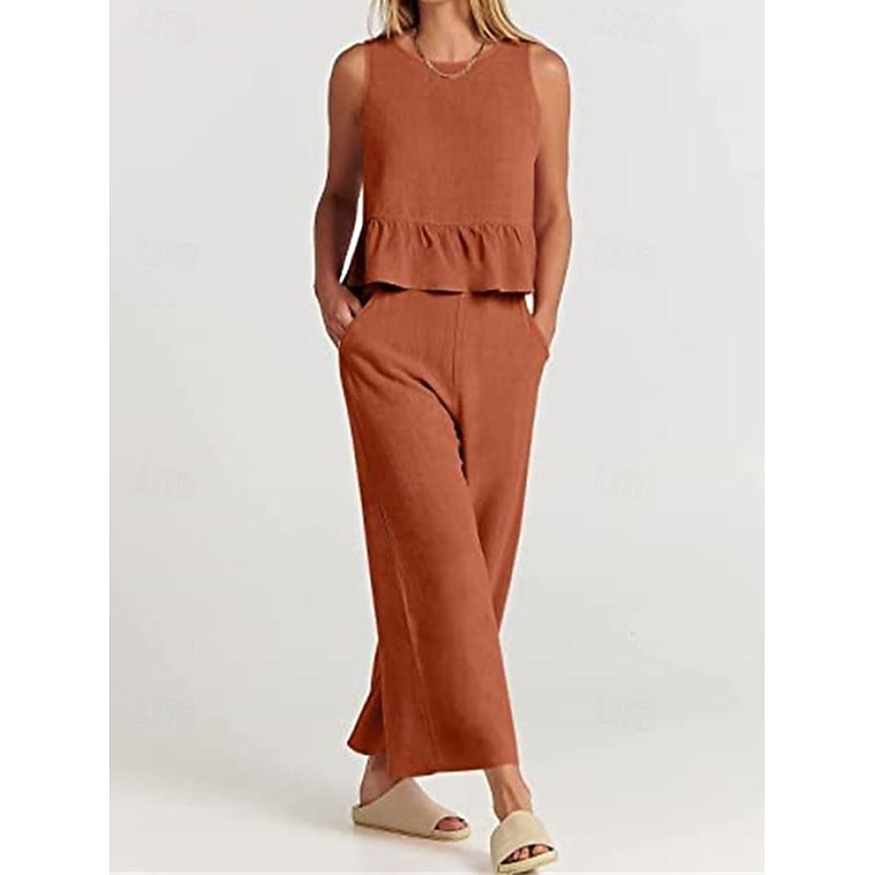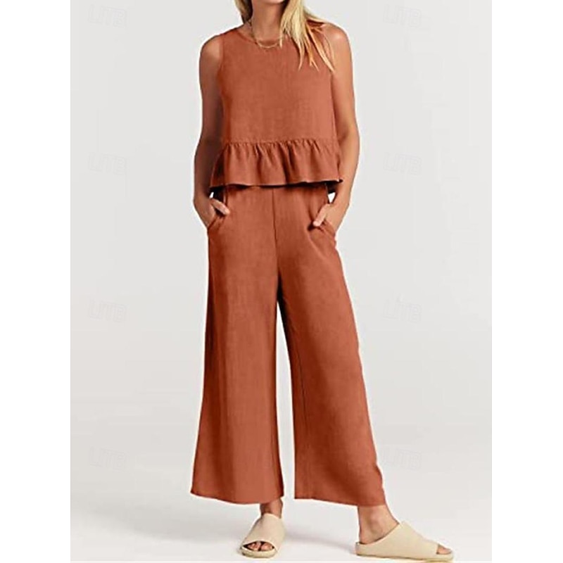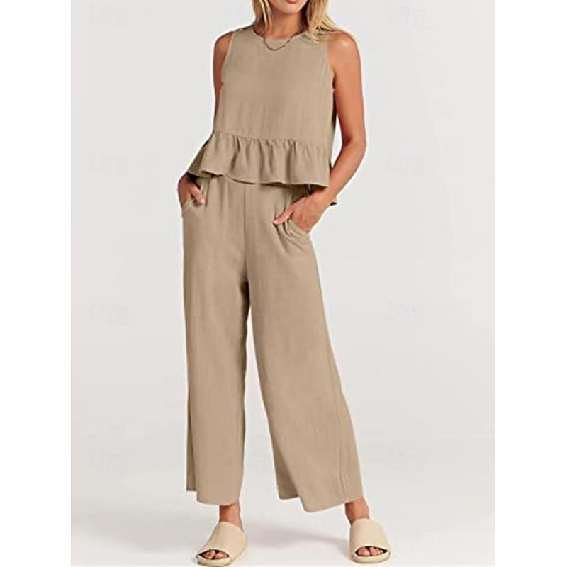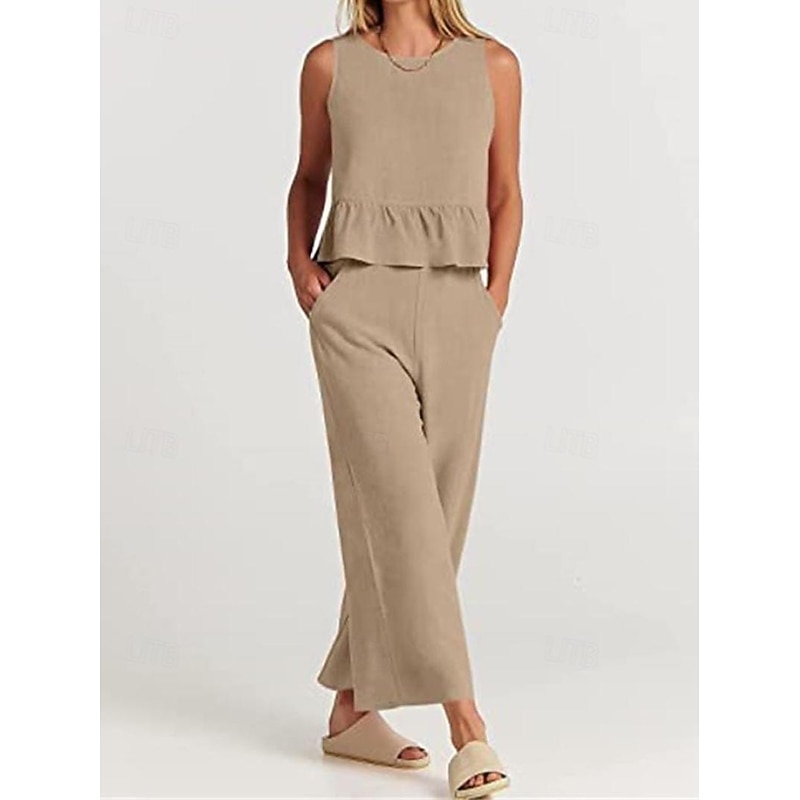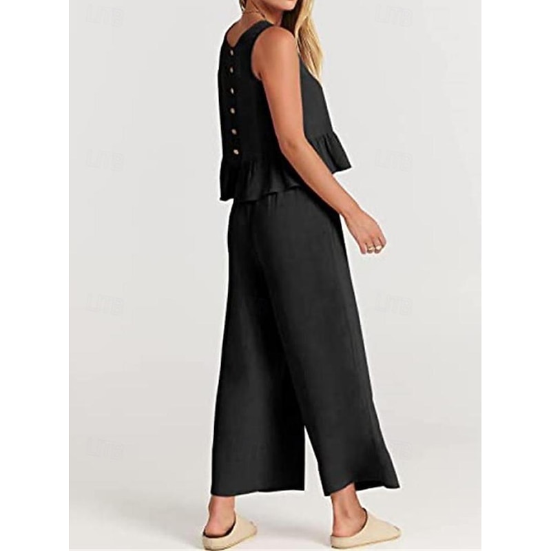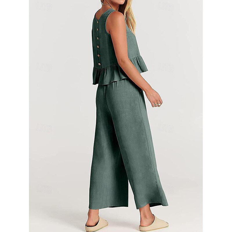 More information about Linen Set Tank Cotton Linen Shirts Set Women's Black Army Green Navy Blue Solid Color Ruffle 2 Piece Street Daily Fashion Round Neck Cotton Linen Regular Fit S