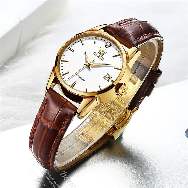 OLEVS Women Mechanical Watch Calendar Waterproof Noctilucent Genuine Leather Watch 12