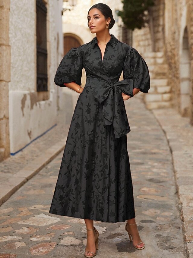 More information about A-Line Cocktail Dresses Elegant Dress Formal Wedding Floor Length 3/4 Length Sleeve Shirt Collar Pocket Satin with Floral Print Bow(s) Slit Wedding Guest Dress