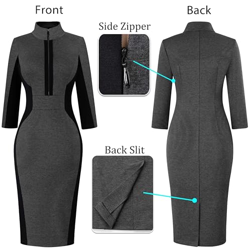• Style: V Neck Collar with Pratical Front Zipper, adds fashion sense and is suitable for variable occasions; 3/4 Three Quarter Sleeves; Patchwork Design creates a slim fit effect; Bodycon Silhouette with a Concealed Side Zipper; Knee Length; A Back Slit for easy walking.