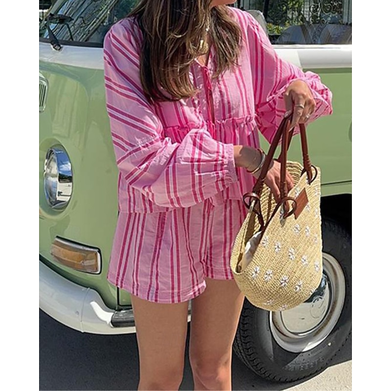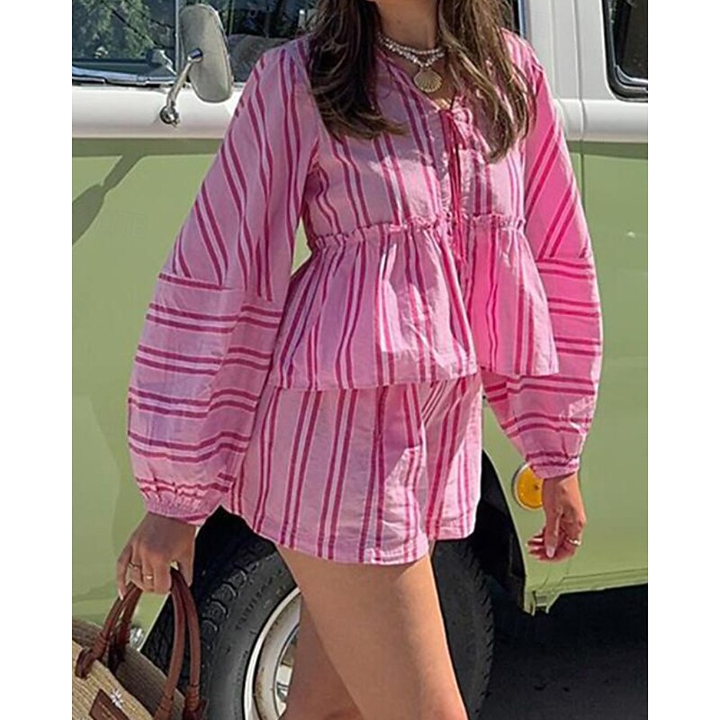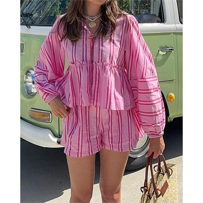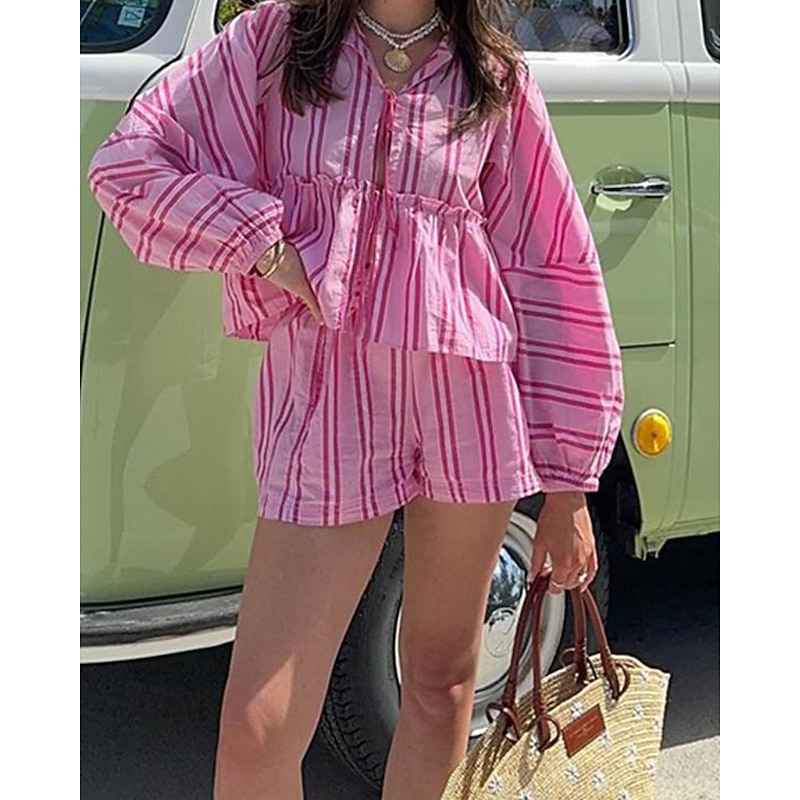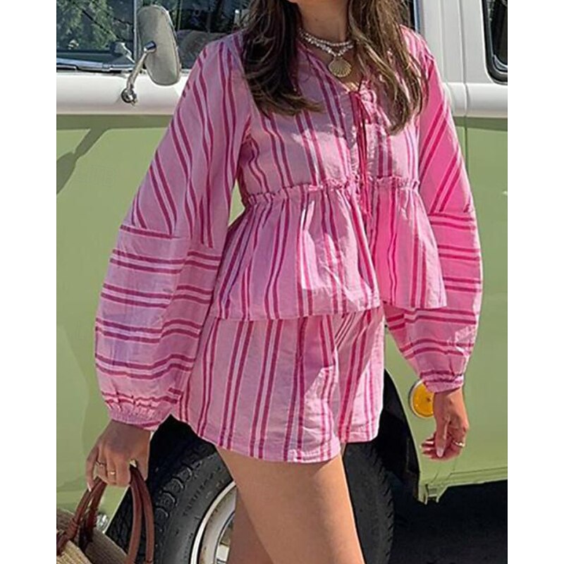 HOT ! Women's Active Streetwear Cotton Linen Shirts Blouse Shorts Sets Long Sleeve V Neck Striped Ruched Daily Casual Daily Pink Green Summer Regular Fit