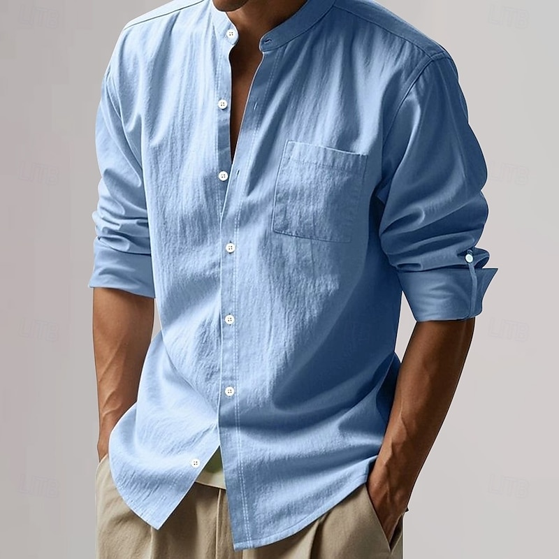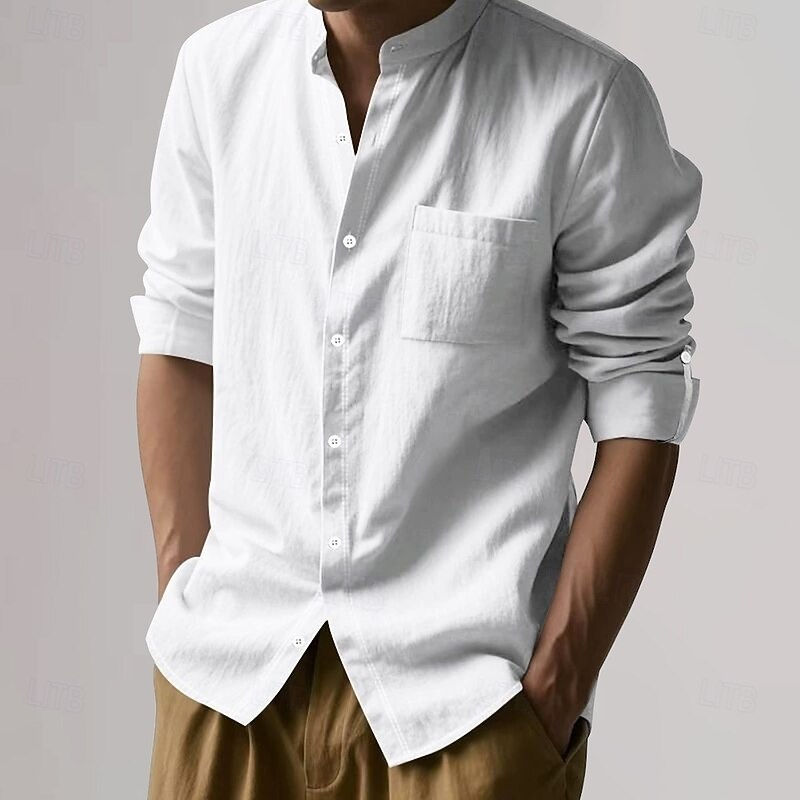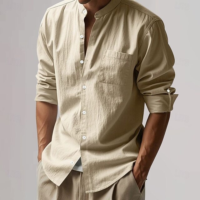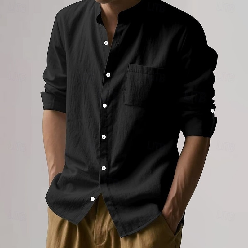 More information about Men's Cotton Linen Shirt Plain Vacation Black White Khaki Dark Gray Long Sleeve Grandad Collar Clothing Apparel Pocket