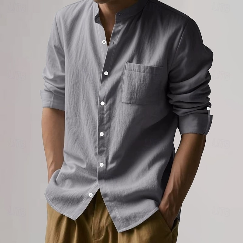 HOT ! Men's Cotton Linen Shirt Plain Vacation Black White Khaki Dark Gray Long Sleeve Grandad Collar Clothing Apparel Pocket