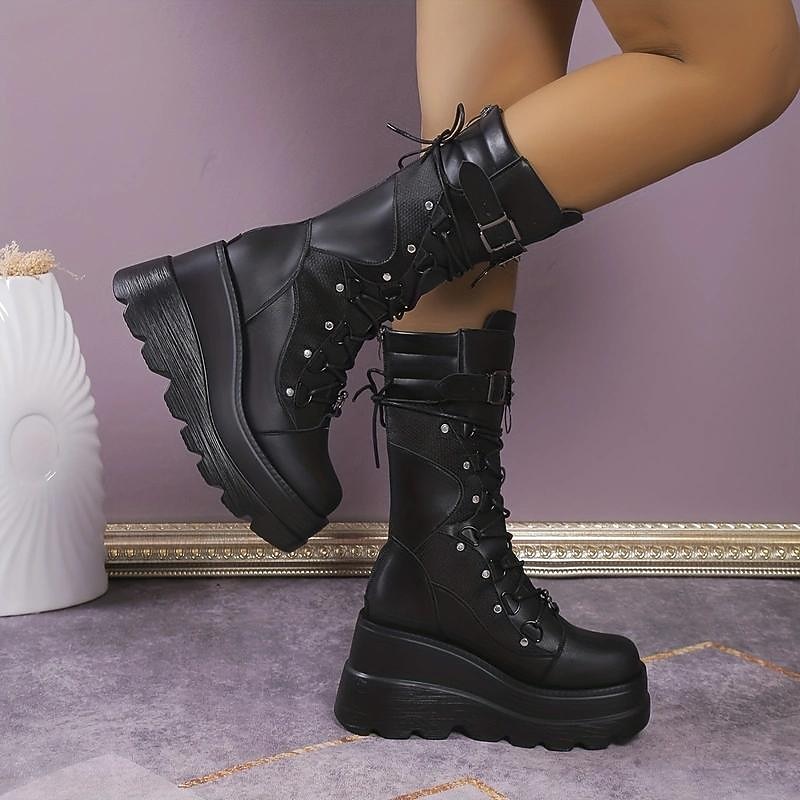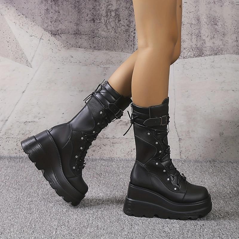 Highlights [Fabric] : These bold black platform boots are constructed from high-quality PU (polyurethane) leather. This material offers excellent durability and a sleek, polished finish that complements the boot's edgy design. [Style] : The boots feature a robust, mid-calf silhouette with a distinctive punk and gothic style. The chunky platform heel, measuring about 2-3 inches, not only adds height but also ensures a comfortable walking experience, reflecting an industrial and edgy fashion sense. [Design Highlights] : Featuring a striking lace-up front with metal eyelets, these boots are accentuated with studded buckles and metal rivets that enhance their rebellious aesthetic. The ridged platform sole and round toe design provide a balanced look that is both stylish and practical, making these boots a standout choice for those looking to embrace alternative fashion. [Occasions] : Perfect for parties, daily wear, or outdoor events, these boots are designed for individuals who want to make a bold fashion statement. Whether you're attending a casual gathering or a themed night out, these boots effortlessly blend style with comfort, ideal for those with a penchant for alternative and gothic fashion. [Size Range] : Available in a range of sizes to ensure a perfect fit for various foot dimensions. The sizes offered include US5.5 to US10.5, accommodating feet of different measurements to provide optimal comfort and support.