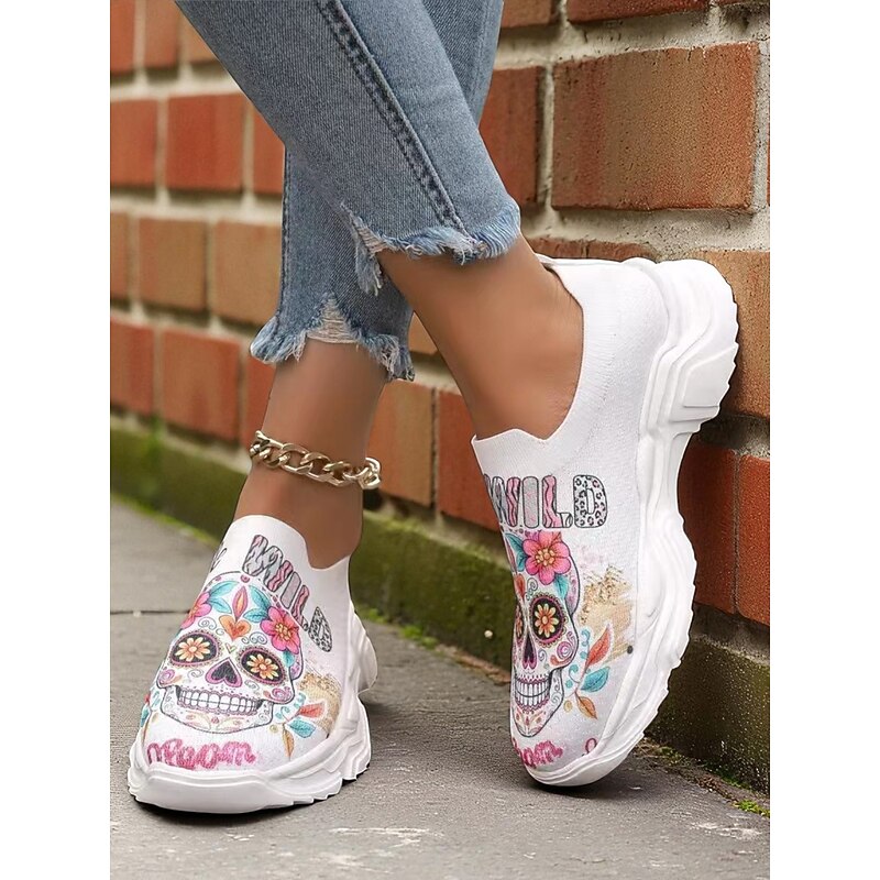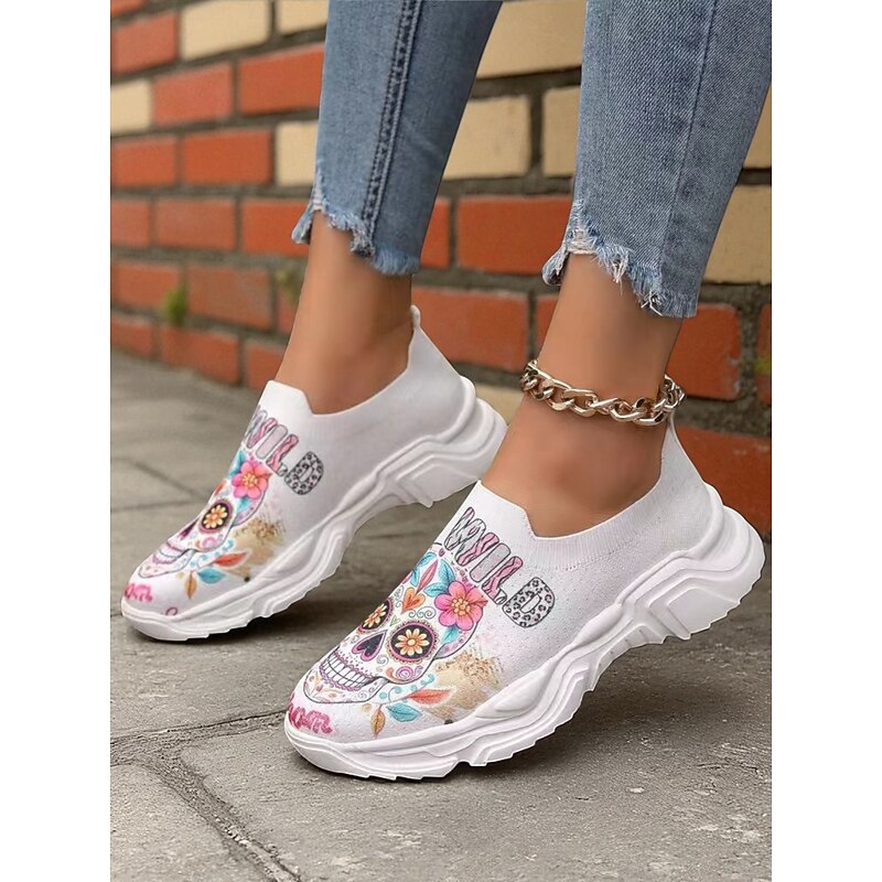 HOT ! Women's Flyknit Slip-On Sneakers with Colorful Sugar Skull Print – Comfortable Casual Shoes for Halloween, Day of the Dead & Fall Parties