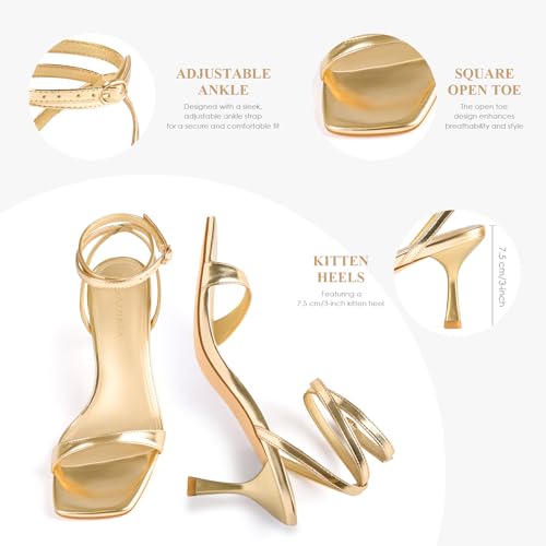 • Metallic Gold Heels: These kitten heel sandals feature a shiny gold metallic upper, perfect for adding sophistication to summer outfits or evening dresses.