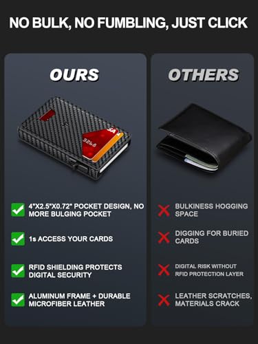 • Quick-Access Convenience - Effortlessly press the side button of the pop up wallet—access your daily card in 1 second. No more digging through bulky bifold wallets! The secure magnetic flip cover features embedded magnets in the premium microfiber flap, snapping closed faster than standard wallets to lock cards securely. A smart choice for men's wallets that combines safety and fashion!