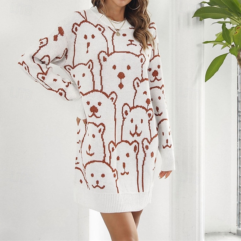 Women's Mini Dress Sweater Dress Knit Dress Casual Dress Fashion Outdoor Party Holiday Regular Fit Animal Long Sleeve Crew Neck White Green Khaki Fall Winter 13