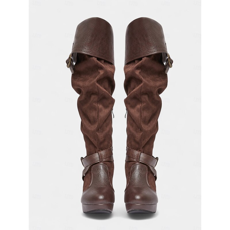 Women's Brown Medieval Over-the-Knee Boots with High Stiletto Heels and Buckle Strap Design, Vintage Renaissance Style Fashion Boots for Costume Parties, Cosplay & Night Out 18