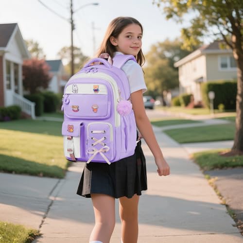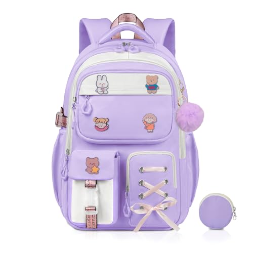 HOT ! Girls Backpack with Coin Purse, Cute Purple/White Bookbag for Kids Teen, Kawaii Aesthetic Elementary School Backpack
