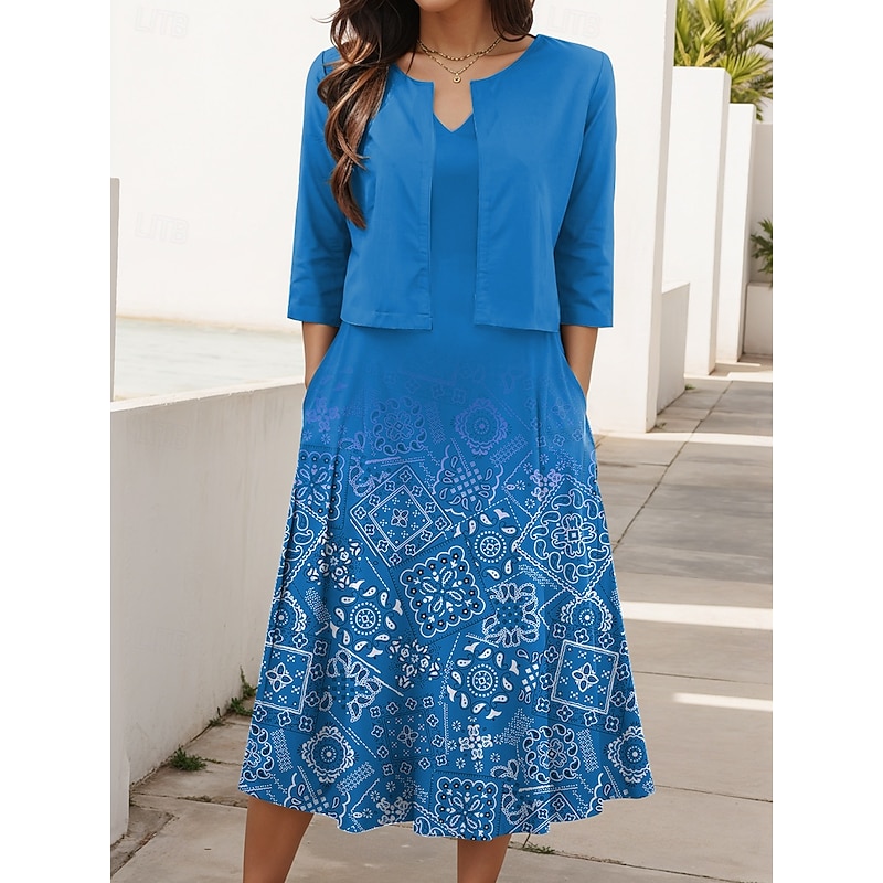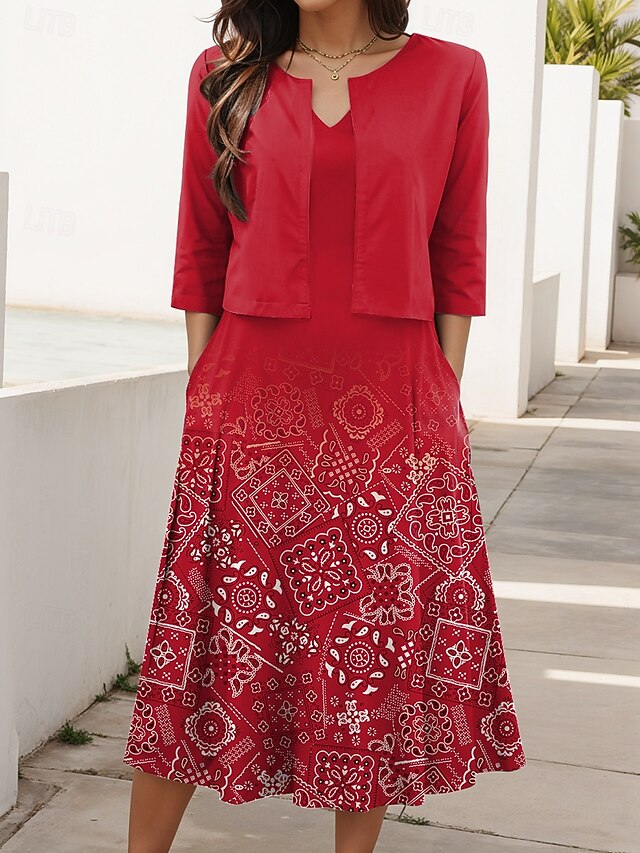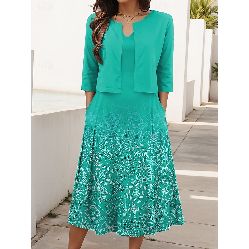 HOT ! Women's Two Piece Dress Sets Midi Dress with Jacket Elegant A Line Dress Half Sleeve Casual Semi Formal Ombre Geometric Print V Neck Date Light Green Red Blue Regular Fit