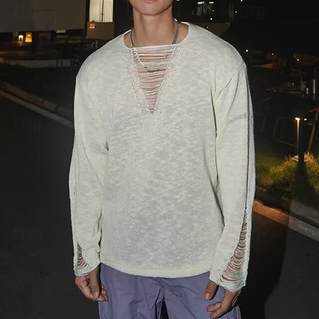 Highlights - Perfect for spring and summer - Made from comfortable polyester fabric - Features long sleeves for added warmth - Designed for men's casual style - Ideal for vacation wear - Unique hole design adds a trendy touch - Classic crew neck neckline complements any look