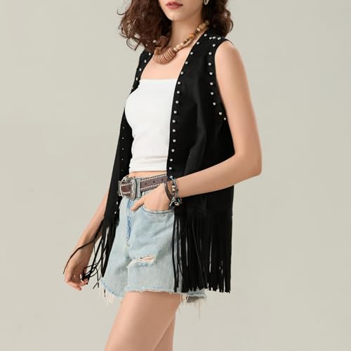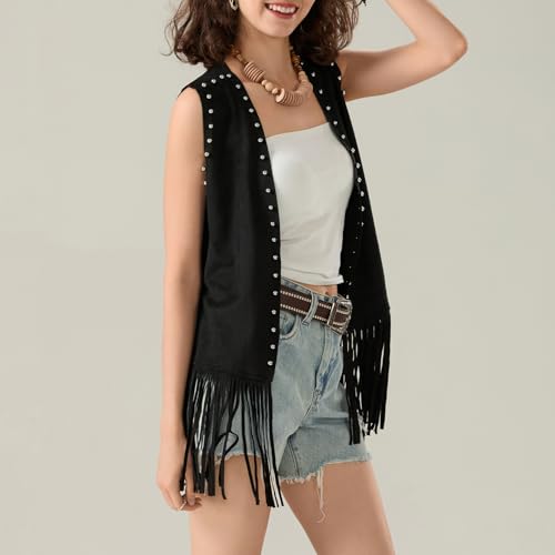 Women's Tassel Sleeveless Vest Rivet Open Front Long Outerwear 70s Hippie Faux Jacket Cowgirl Western Cardigan 7