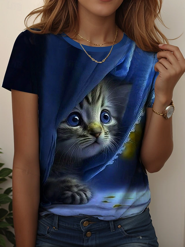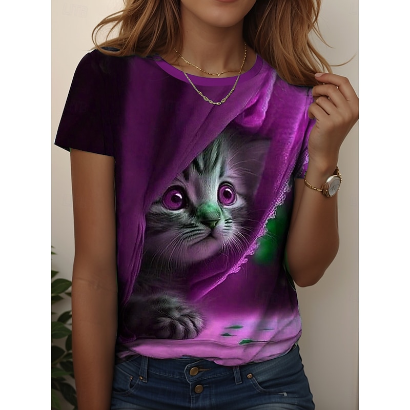 More information about Women's T Shirt Graphic Animal Cat Vintage Stylish Classic Short Sleeve Crew Neck Regular Tops Daily Weekend Print Blue Purple Green Summer Spring