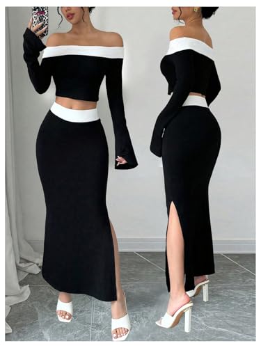 • Features: 2 piece outfits for women, colorblock skirt set, off shoulder long sleeve tshirt and split bodycon skirt