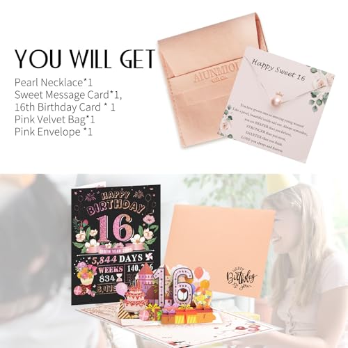 ✨Celebrate Her 16th! Aiunmiol exclusive 16th Birthday Gift Set for Girls. Make her milestone birthday unforgettable with this fun and special gift set for your daughter, niece, or granddaughter🏰Pretty Pink 16th Birthday Pearl Necklace: Crafted with high-quality Sterling Silver (S925) and shimmering simulated pearls. This hypoallergenic necklace is safe for sensitive skin. The adjustable chain (15 to 17) ensures a outstanding fit. It's the perfect 16th birthday keepsake!💌Large Pop-Up Surprise 16th Birthday Card - Not a boring card! Our stunning 3D card pops open to reveal a dazzling, glittering 16. Intricate laser-cutting creates an amazing 3D effect guaranteed to bring surprise and cheers to the birthday party!✨Shimmering Pink Cover & Birth Year Memories: The cover features a gorgeous gradient pink design with hot-stamped gold foil details. Text on the card catches the light, creating a radiant pink glow from every angle. Inside, take a fun trip down memory lane with iconic facts from her birth year💝Perfectly Pink Gift Set Includes: Pink pearl necklace, Blessing card, pink jewelry storage pouch, and large pop-up 16 birthday card. Create lasting memories for your special girl! The ultimate pink birthday gift for family and friends💯100% Satisfaction Guarantee - 9,000+ happy customers in 2025! If your item arrives damaged: ①Message us → ②Get free replacement within 24 hours. Every gift is crafted with love. Order yours today! Perfect for everyday use. supreme materials and excellent craftsmanship ensure long-lasting durability.