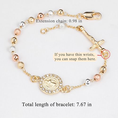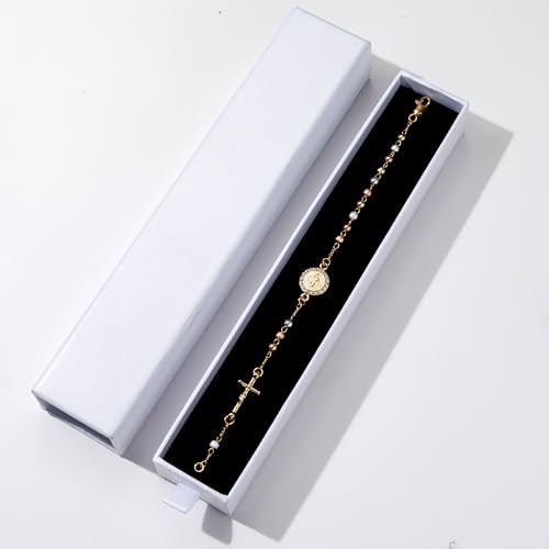 Material: BrassMetal type: Gold plated brassClasp type: Lobster ClawChain type: Rosary ChainMetal weight: 4.8 gGem type: No gemstoneMaterial: Catholic rosary chain bracelet made of gold-plated brass, bright and shiny colour, not easy to fade.Size: The length of the chain rosary bracelet is 7.67 inches (19.5cm), the size of the beads is 3mm, and the size of the gift box is 7.8*1.4inches (20*3.5cm). The bracelet is the length for most wrists and the adjustable chain makes it easy to wear.Design: This gold plated catholic rosary bracelet features the Guadalupe (Saint Benedict) and the crucifix with gold, silver and pink rosary beads. The design is beautifully detailed and adds a touch of elegance to your outfit.Gift: We use gift box packaging, simple and generous, a meaningful gift for family or friends. The gold plated rosary bracelet is a thoughtful little gift and you can give it on various occasions such as birthdays, anniversaries, first communions, or confirmations and more. This item is not intended for users under 12 year old.Meaningful: Wearing this Guadalupe (Saint Benedict) chain rosary bracelet expresses your faith and brings you comfort and protection, carrying your faith with you wherever you go. Perfect for everyday use. supreme materials and excellent craftsmanship ensure long-lasting durability.