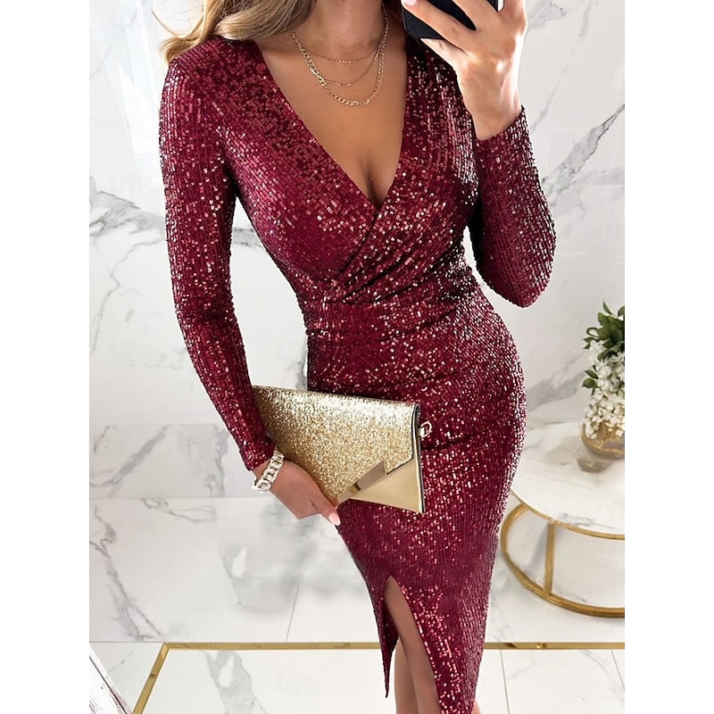 Women's Midi Dress Sequin Dress Casual Dress Elegant Dress Casual Sports & Outdoor Street Evening Party Regular Fit Plain Long Sleeve V Neck Silver Black Wine Fall Winter
