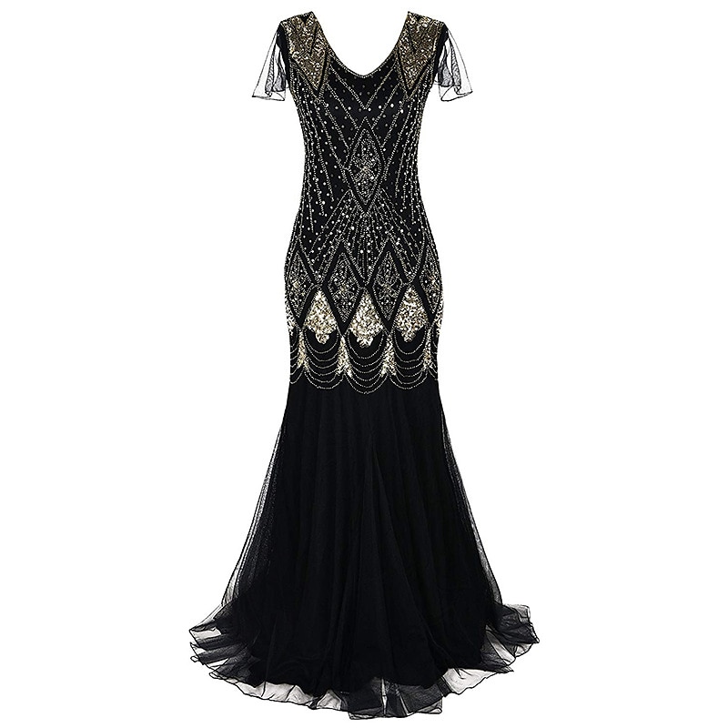 Inspired by Art Deco, the dress boasts intricate beadwork and geometric patterns that exude vintage charm. The sleeveless style and V-neckline bring a latest touch, while the sequin details and sheer mesh offer a glamorous and sophisticated flair.