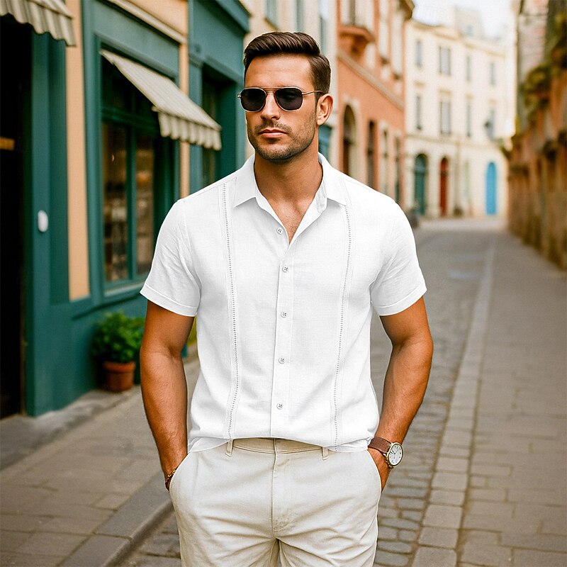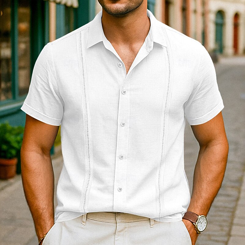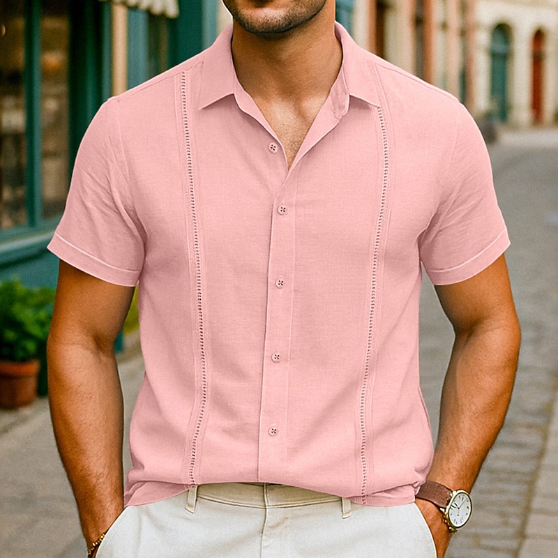 More information about Men's Shirt Linen Shirt Summer Shirt Beach Shirt Summer Hawaiian Shirt Solid Color Vacation Street White Pink Light Blue Short Sleeve Collar Summer Spring & Summer Clothing Apparel Patchwork