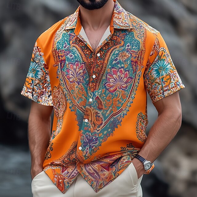 More information about Men's Floral Print Indian Boho Shirt Summer Hawaiian Shirt Button Up Shirt Short Sleeve Hawaiian Vacation Holiday Beach Wear Summer Spring Turndown 3D Print Collared Shirts Blue Orange
