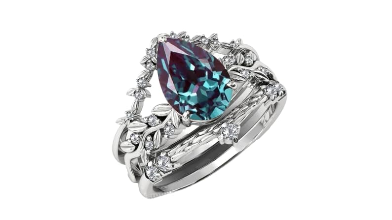 More information about Vine Leaf Design Alexandrite Engagement Ring Set Pear Shaped Alexandrite Bridal Ring Set 925 Sterling Silver Alexandrite Wedding Ring Set (QS-AL-53)