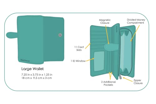 - 11 card slots for organizing your essentials. Clear ID window for prompt access. Large bill compartment for cash and receipts