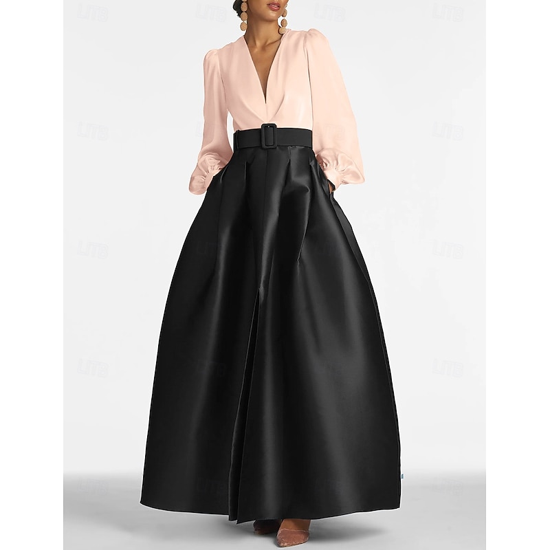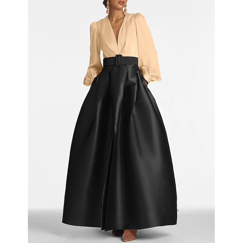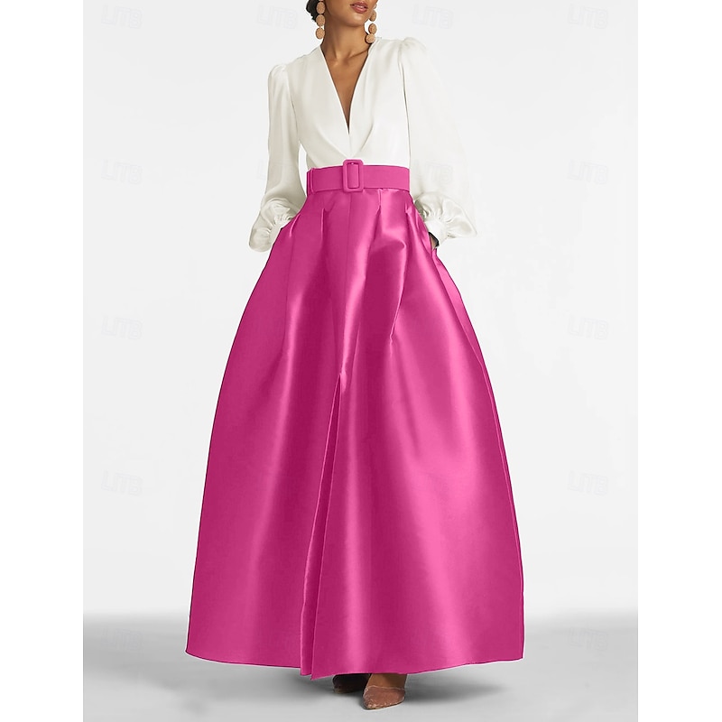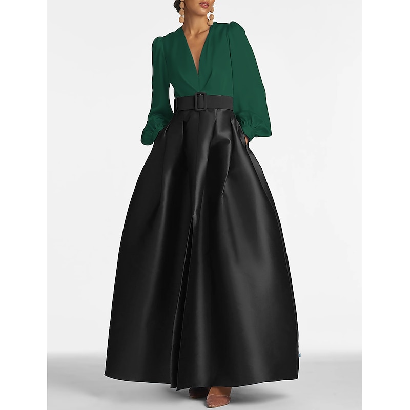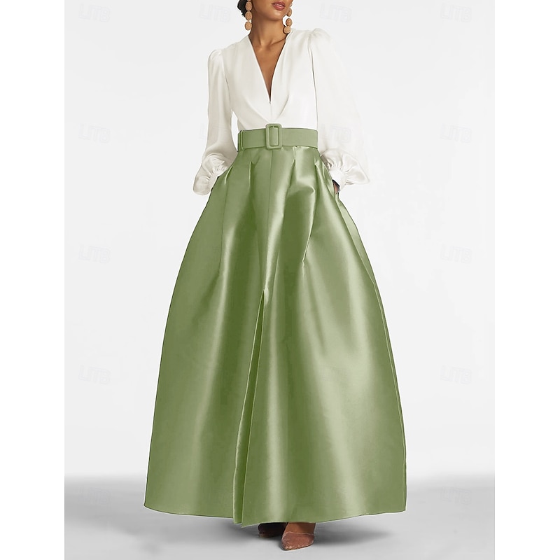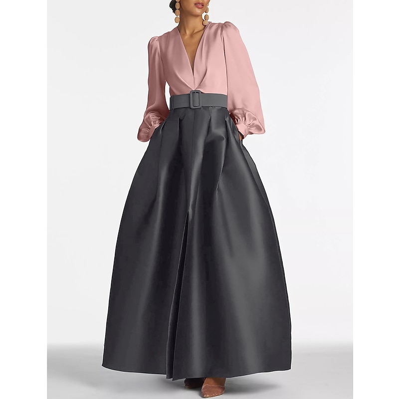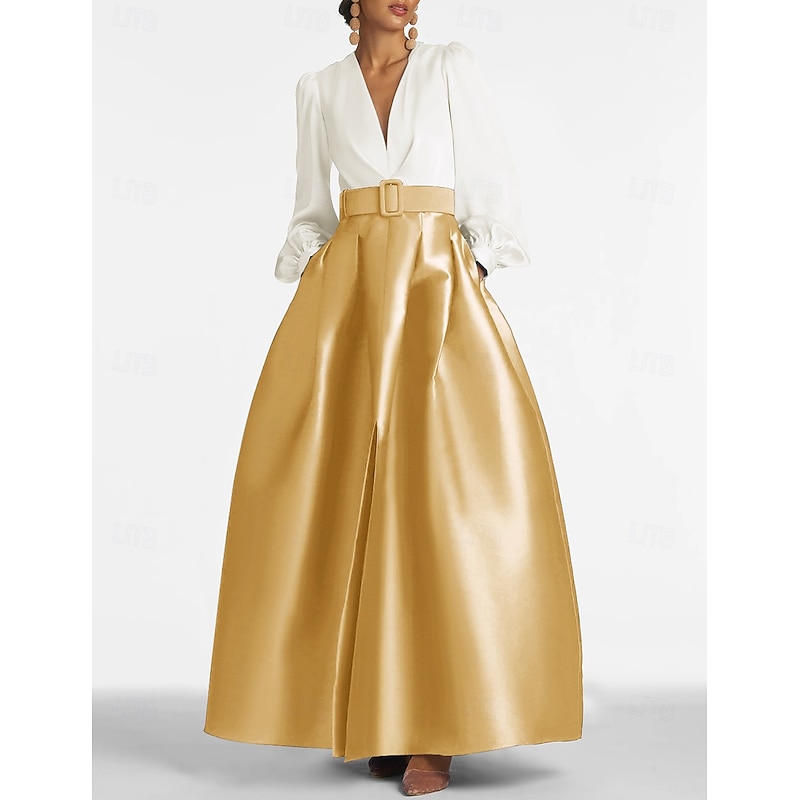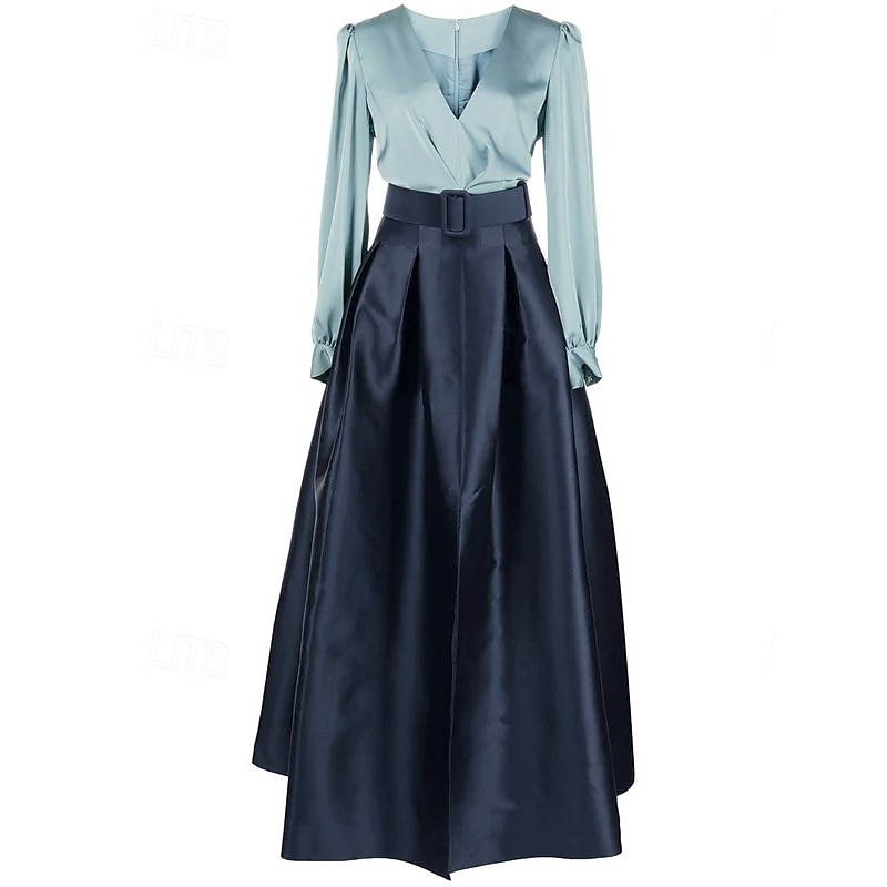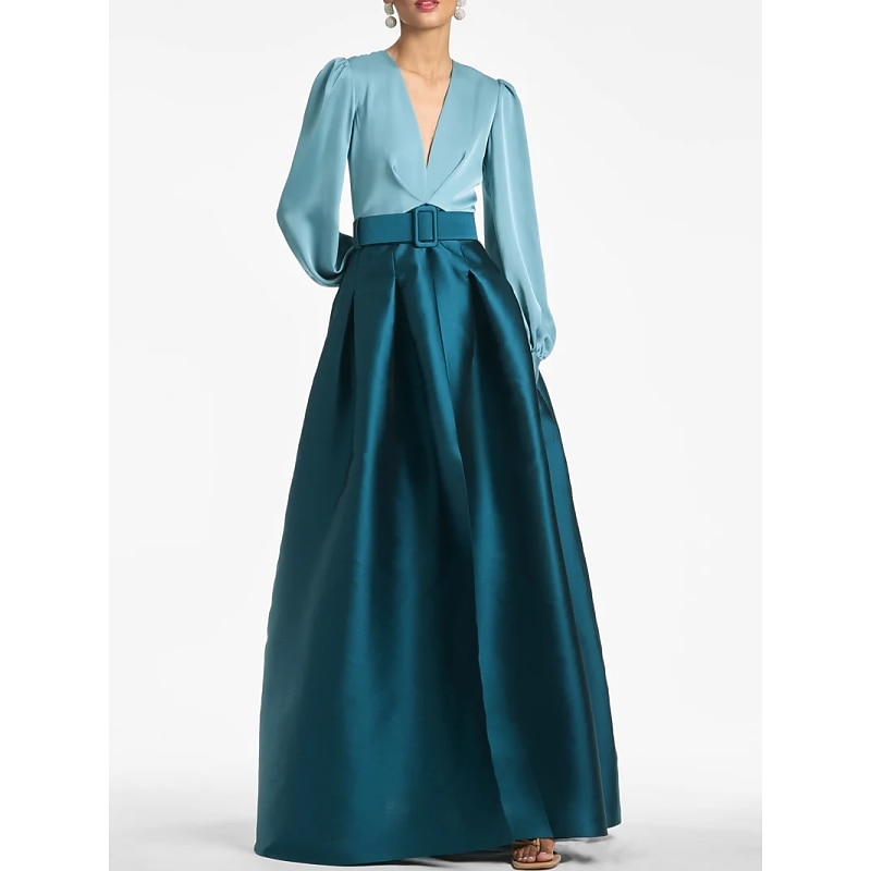 popular ! A-Line Evening Gown High Split Dress Formal Wedding Guest Floor Length Long Sleeve V Neck Belt / Sash Satin with Pleats Slit