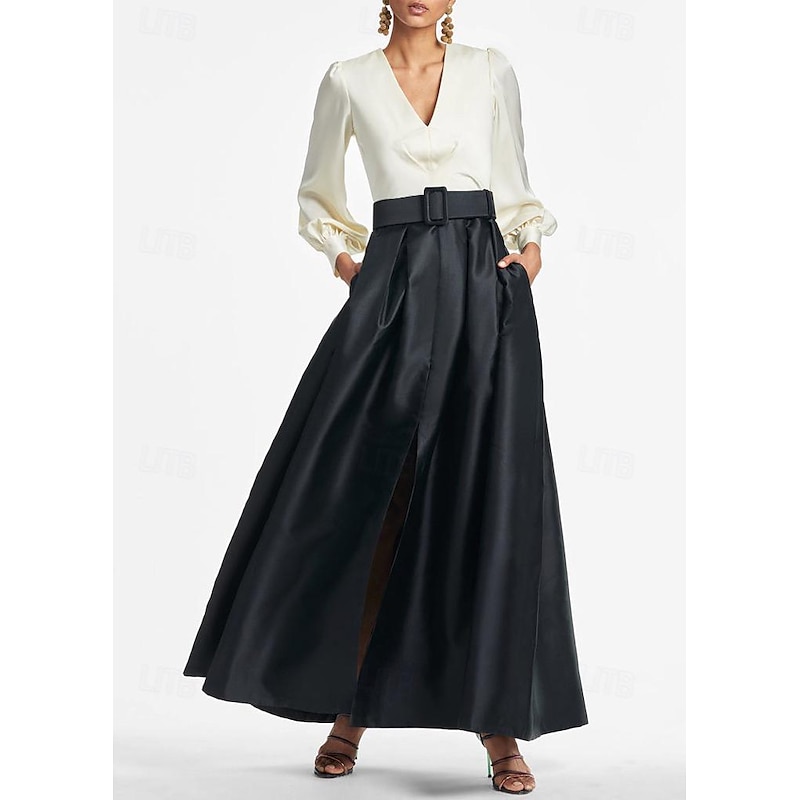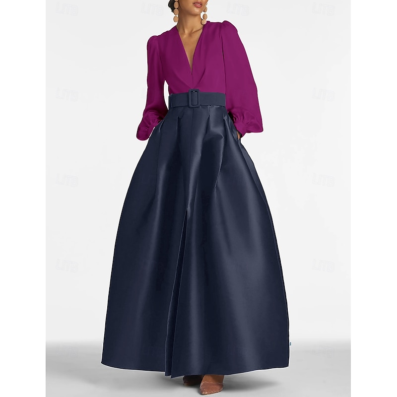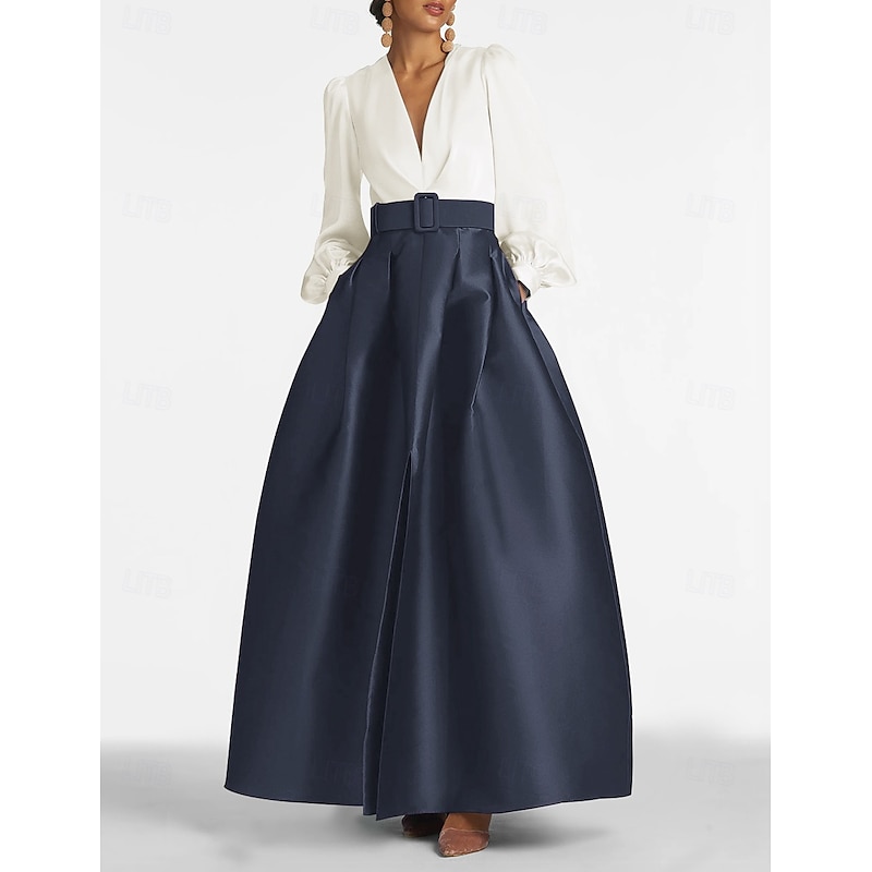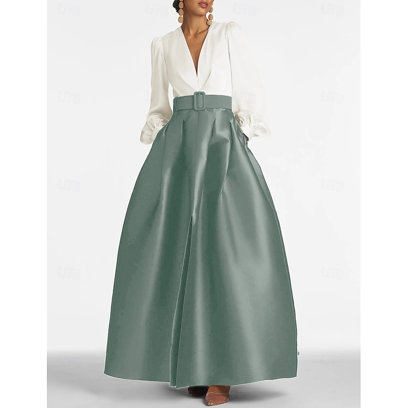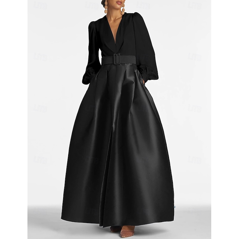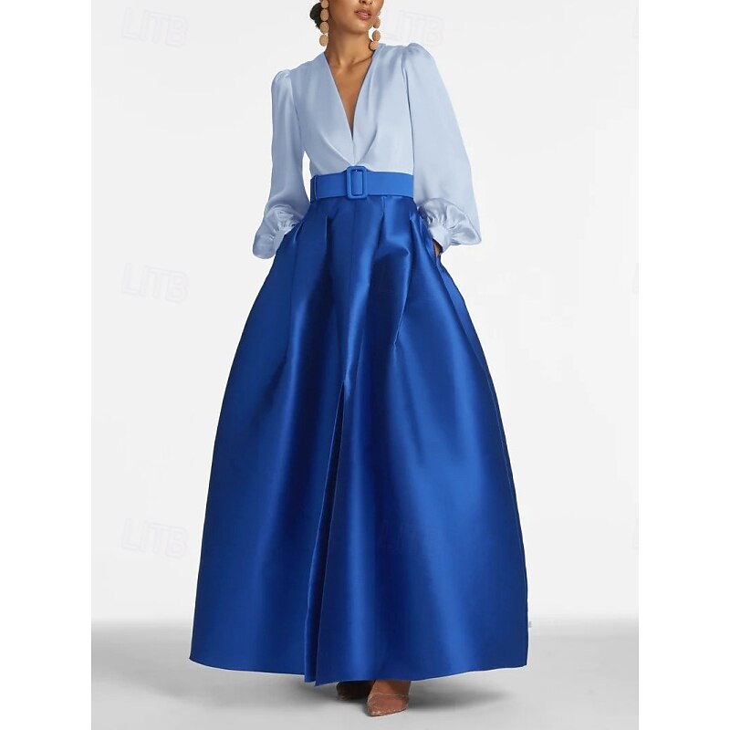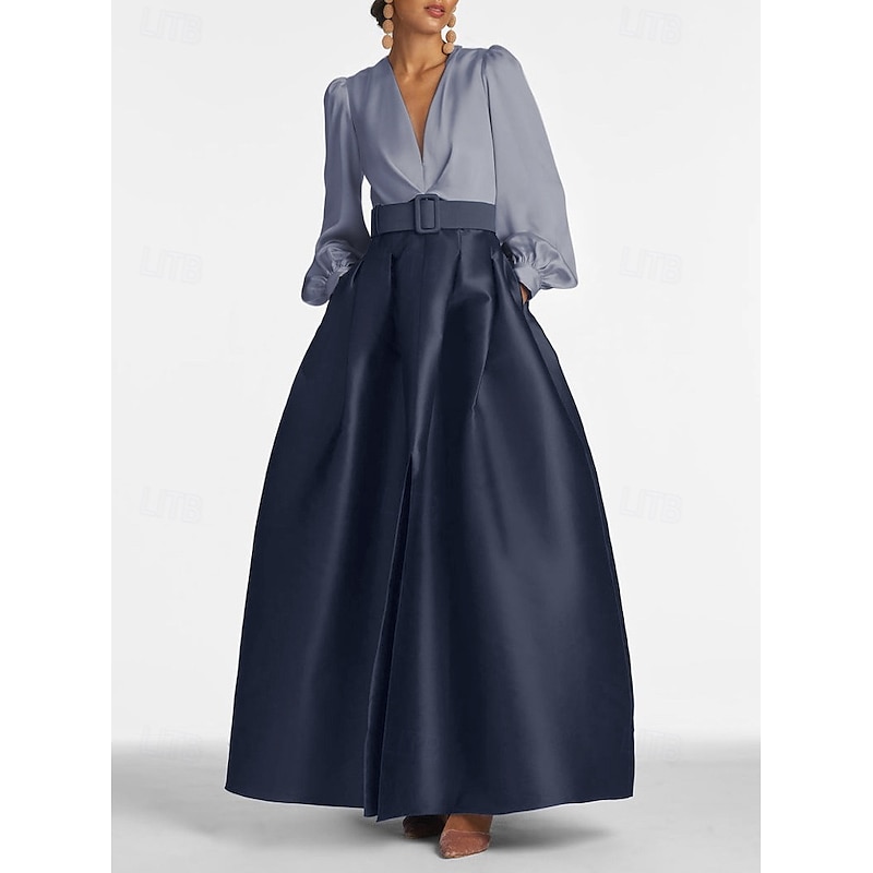 More information about A-Line Evening Gown High Split Dress Formal Wedding Guest Floor Length Long Sleeve V Neck Belt / Sash Satin with Pleats Slit