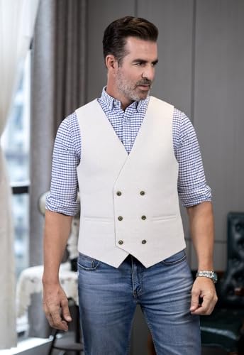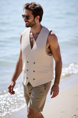 SOLOVEDRESS Men's Linen Cotton Suit Vest Summer Leisure Double Breasted Dress V Neck Waistcoat for Party and Beach